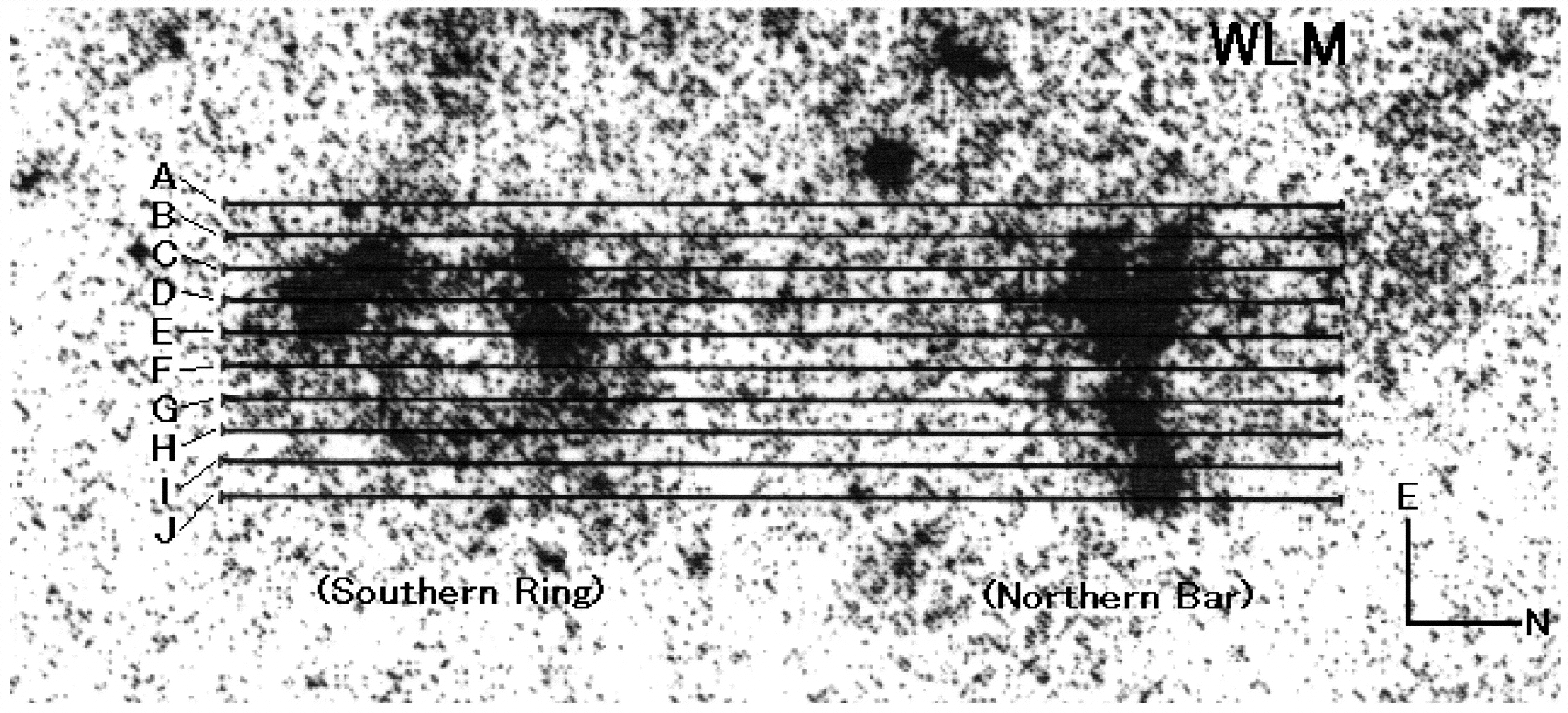 Slit positions superposed on the Hα images. The length of each line corresponds to the length of the abscissa in Fig. 2. (a) NGC 2366: the Hα image is taken from Fig. 1 in Roy et al. (1991). The length of the line corresponds to 160﹩\arcsec﹩. (b) Holmberg II: the Hα image is taken from Fig. 1 in Hodge et al. (1994). The length of the line corresponds to 250﹩\arcsec﹩. (c) IC 2574: the Hα image is taken from Fig. 3 in Miller & Hodge (1994). The length of the line corresponds to 200﹩\arcsec﹩. (d) WLM: the Hα image is taken from Fig. 1a in Hodge & Miller (1995). The length of the line corresponds to 200﹩\arcsec﹩.