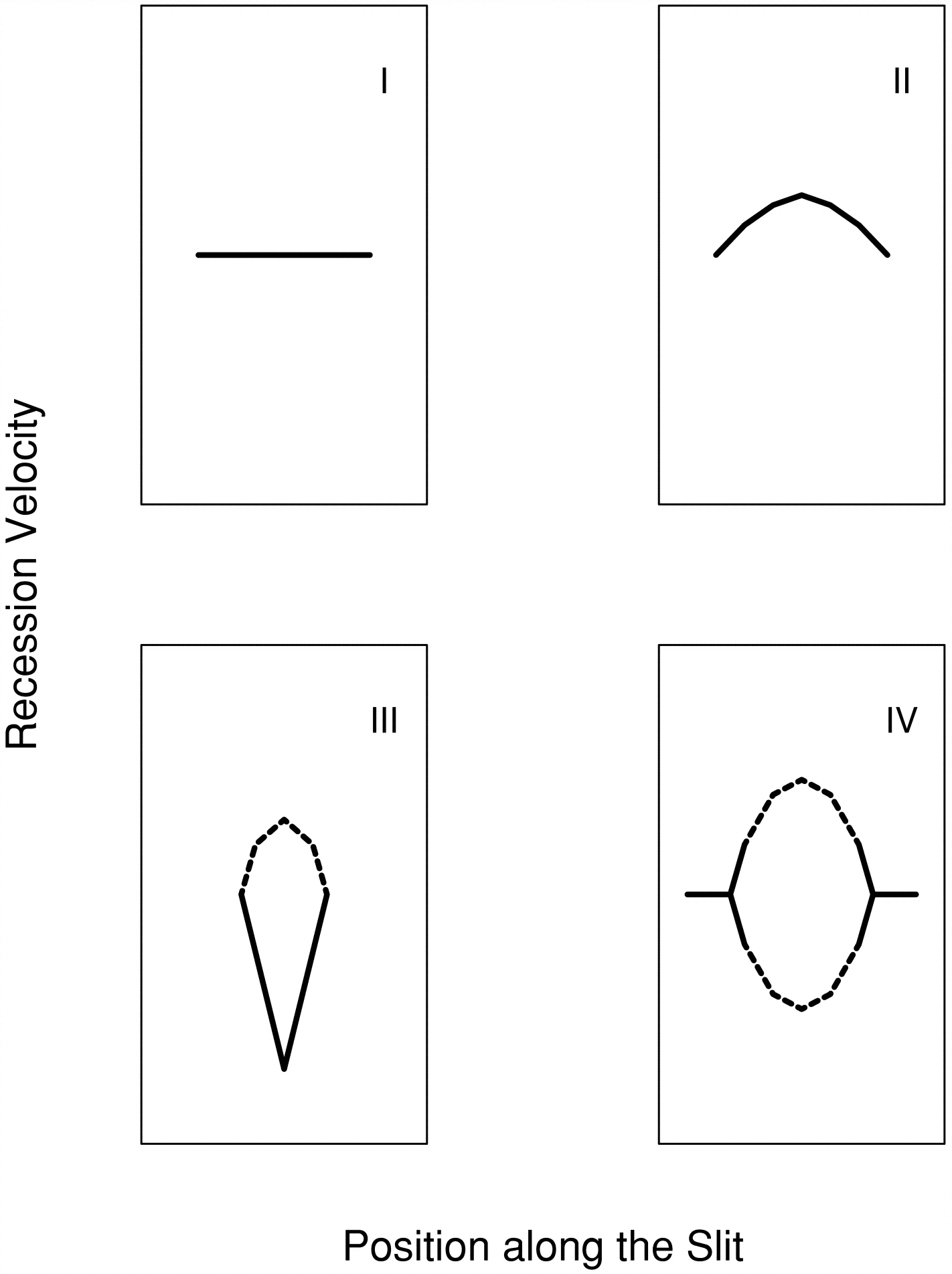 Schematic pictures of four types of the velocity features in the position‐velocity diagram. In ordinate, the top direction indicates larger recession velocity. The type is shown in the top right‐hand corner in each panel.