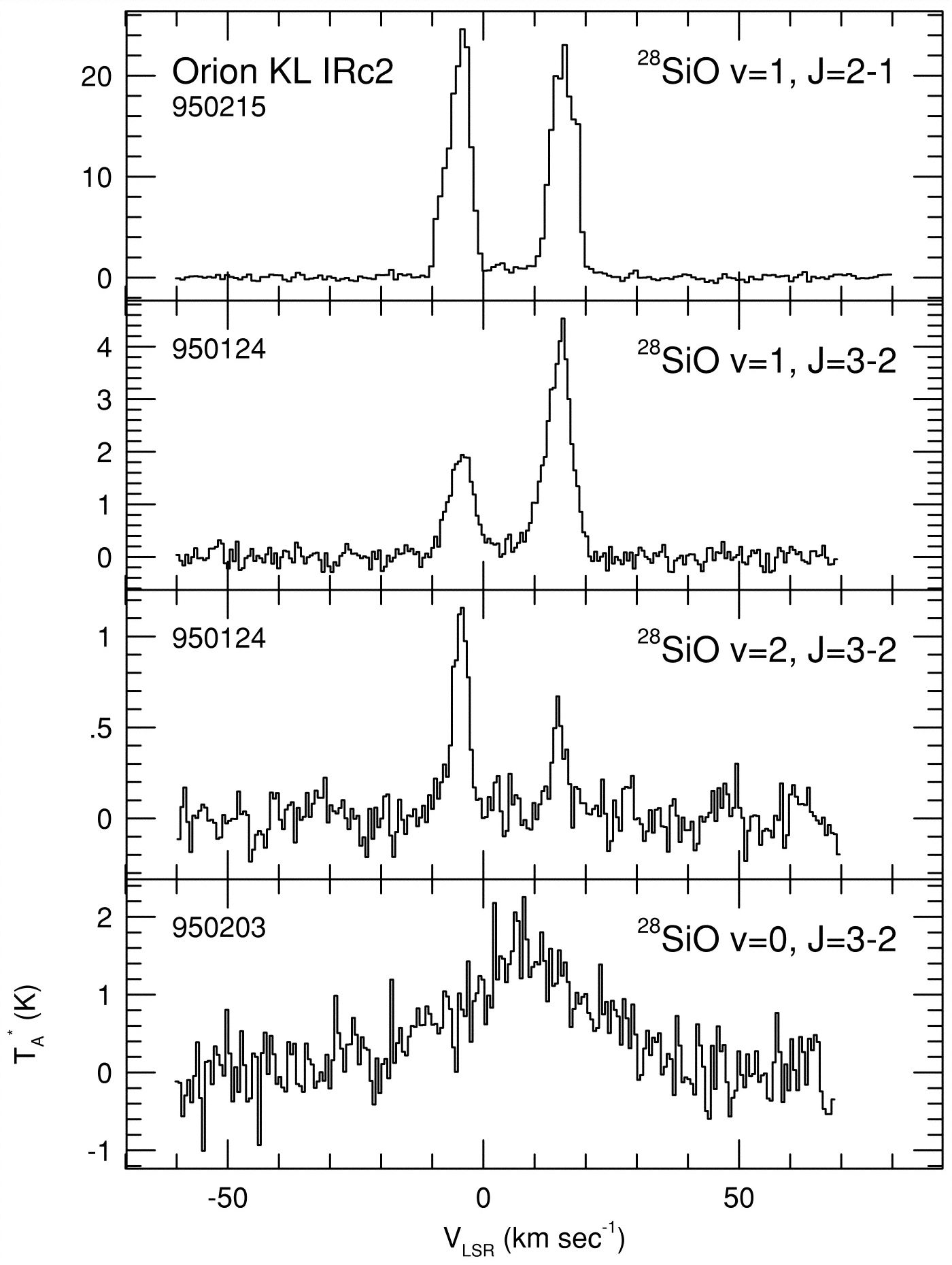 Spectra of the 28SiO v = 1, J = 2–1, v = 0, 1, 2, and J = 3–2 transitions from Orion KL IRc2, observed in 1995 January and February. Dates of observations and transitions are given.