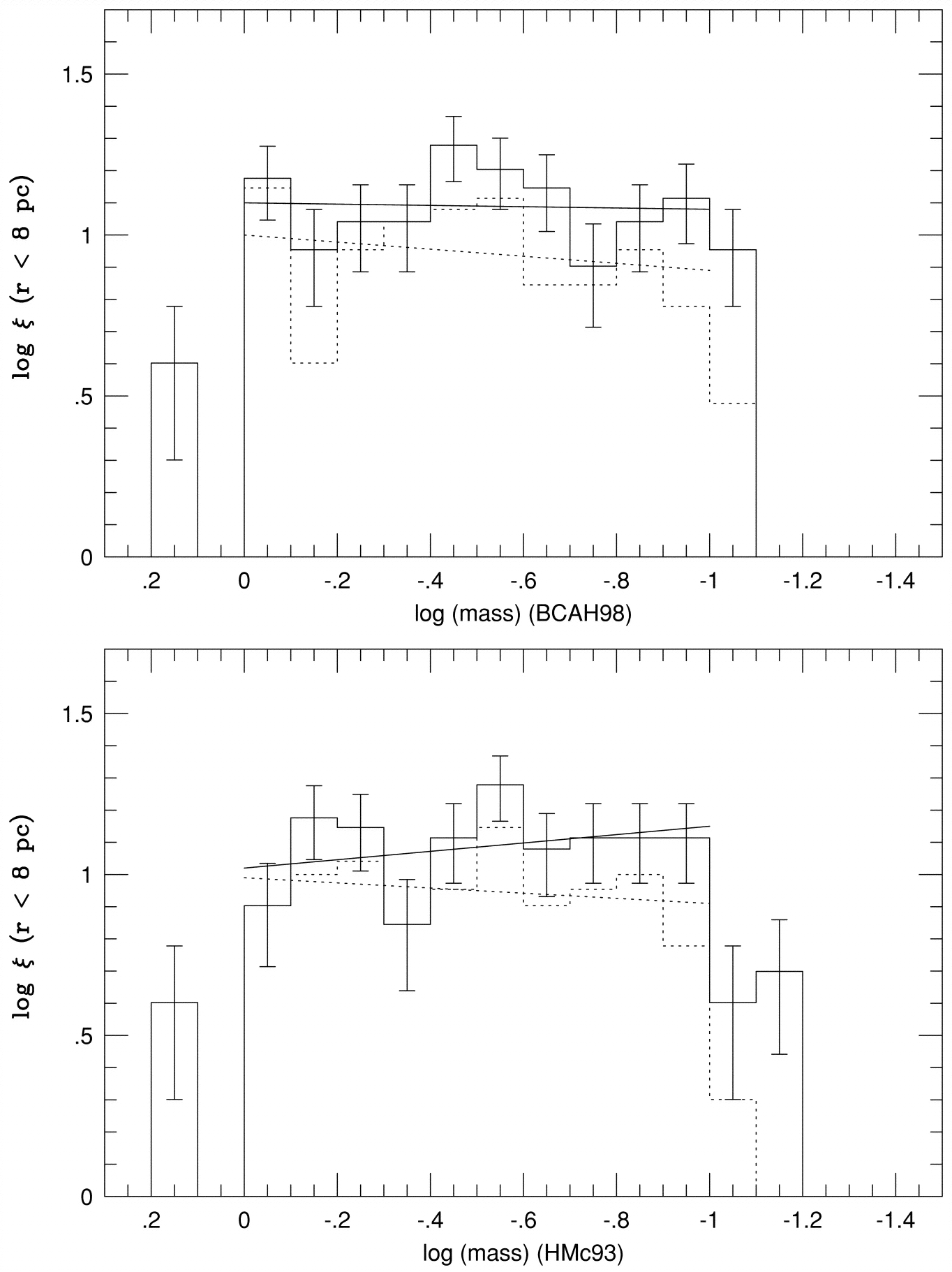 Stellar mass function defined by the northern 8 pc sample. The upper diagram plots the results if we adopt the empirical HMc93 calibration; the lower for masses calibrated by the 1 Gyr BCAH98 isochrone. In both cases the solid histogram/line delineates the star‐by‐star function; the dotted line marks the systemic function.