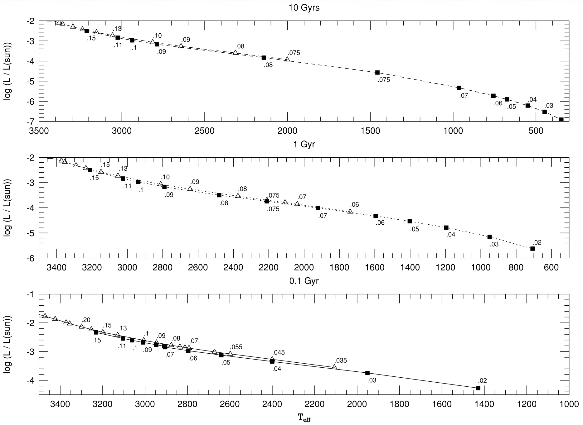 Comparison between the Burrows et al. (1993, 1997) (filled squares) and Baraffe et al. (1998) models (open triangles) in the (log II L, Teff)‐plane. The Burrows et al. data are plotted for masses of 0.02, 0.03, 0.04, 0.05, 0.06, 0.07, 0.075, 0.08, 0.09, 0.1, 0.11, and 0.15 M⊙; the Baraffe et al. data points are for masses of 0.035, 0.045, 0.05, 0.06, 0.070, 0.072, 0.075, 0.08, 0.09, 0.10, 0.13, 0.15, 0.175, 0.20 M⊙ (0.1 Gyr); 0.06 M⊙ et seq. for 1 Gyr; and 0.075 M⊙ et seq. for 10 Gyr.