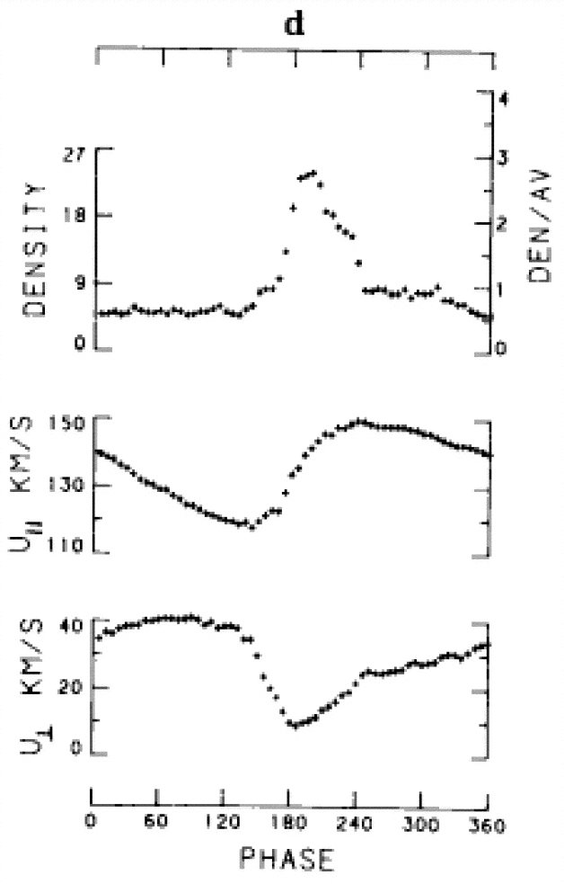 Cloud density (top) and velocity components (middle, tangential; bottom, radial) plotted vs. spiral phase, from RS87 dissipative simulations, case M. For a tightly wound spiral, a cut through the spiral phase is roughly equivalent to a cut in radius. This particular figure is at a time step 1170 Myr.