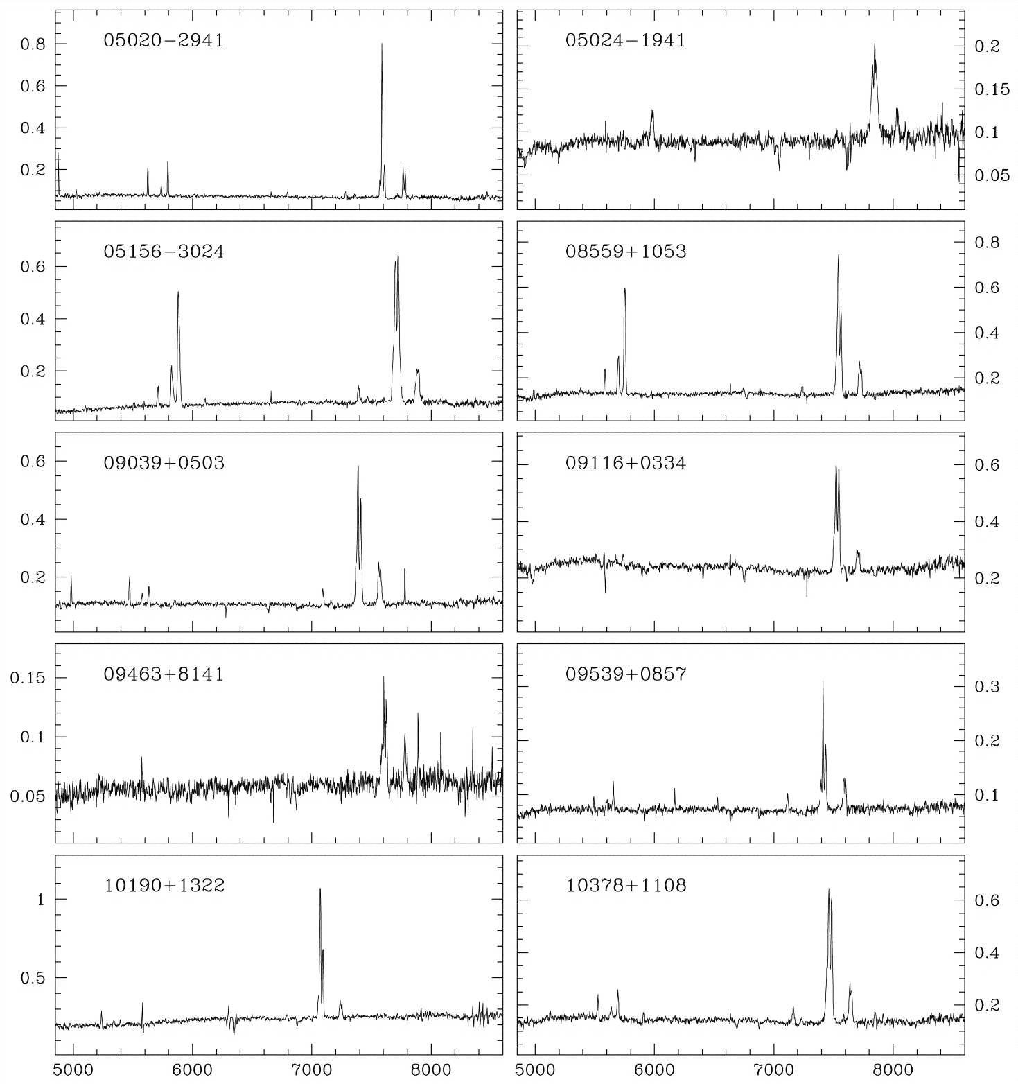 Optical spectra of the ULIGs in the KPNO sample—﹩f_{\lambda }﹩ vs. λobserved. The units of the vertical axis are 10−15 ergs s−1 cm−2 Å−1, and the wavelength scale is in angstroms.