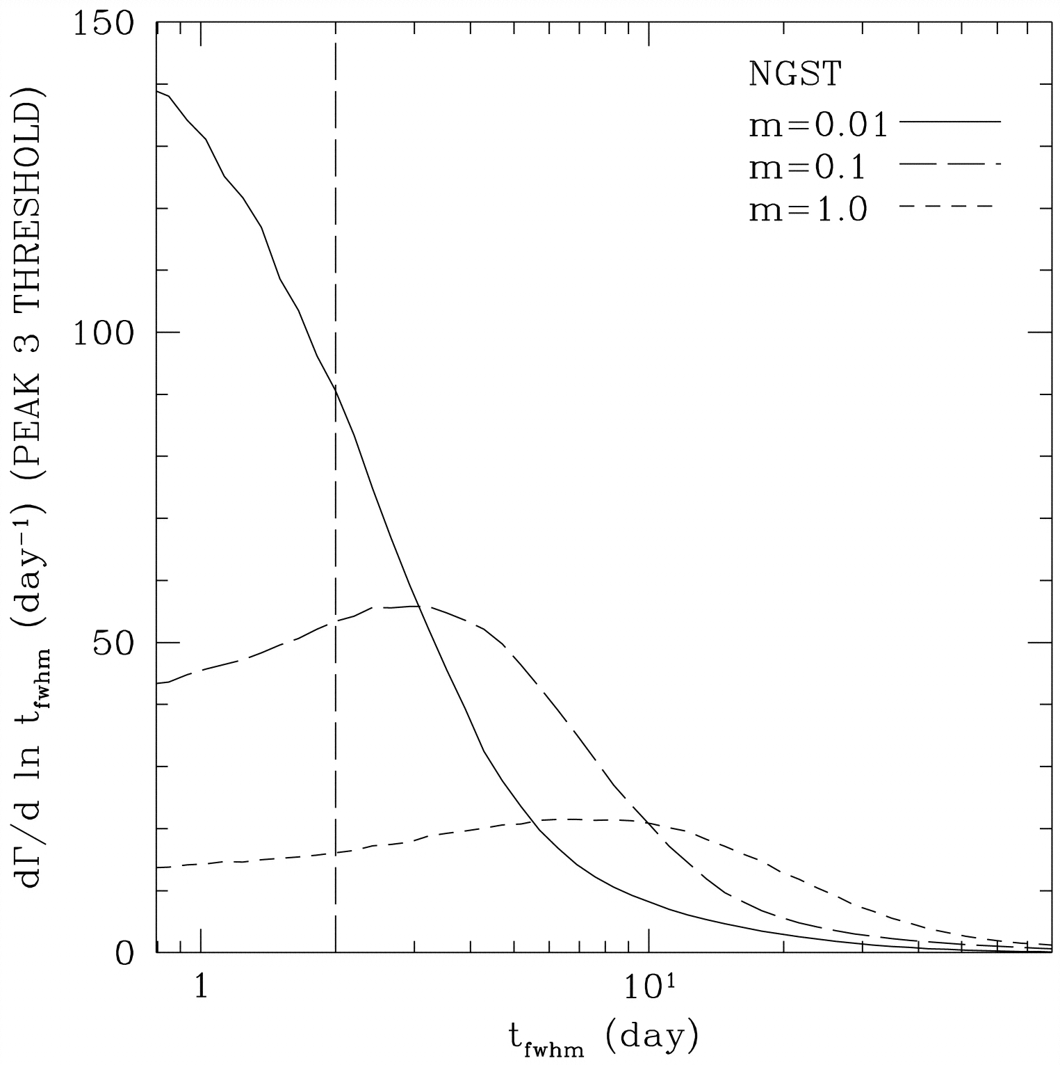 Pixel lensing rates for the improved peak‐threshold trigger on WFPC2, AC, and NGST. The spacing of observations is 1 day, except in the bottom right plot, where it is 6 hr.