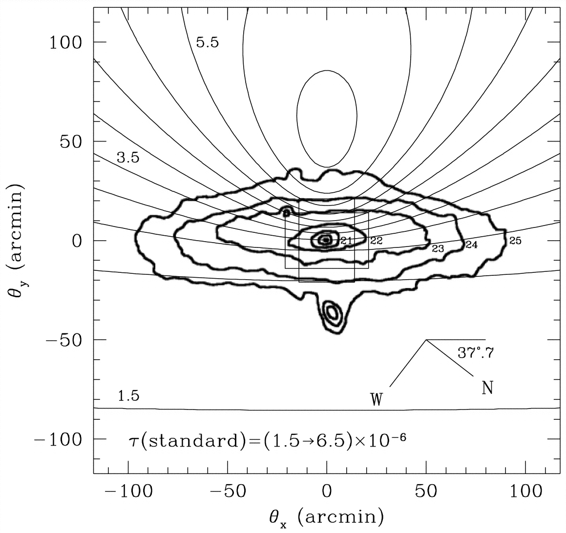 Contours of constant optical depth to the disk of M31. These are given in (dimensionless) units of ﹩10^{-6}﹩. The isophotes (thick lines) are taken from Hodge & Kennicutt (1982), and are 19, 20, 21, 22, 23, 24, and 25 B mag arcsec−2. The rectangular boxes show the field of view of the CFHT 12k CCD, centered on M31 and aligned along both the major and minor axes.
