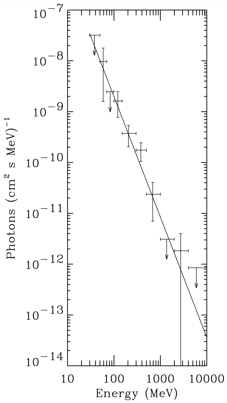 Spectrum of 3EG J0222+4253 (3C 66A) during VP 15.0. The spectral index is ﹩2.37\pm 0.29﹩.