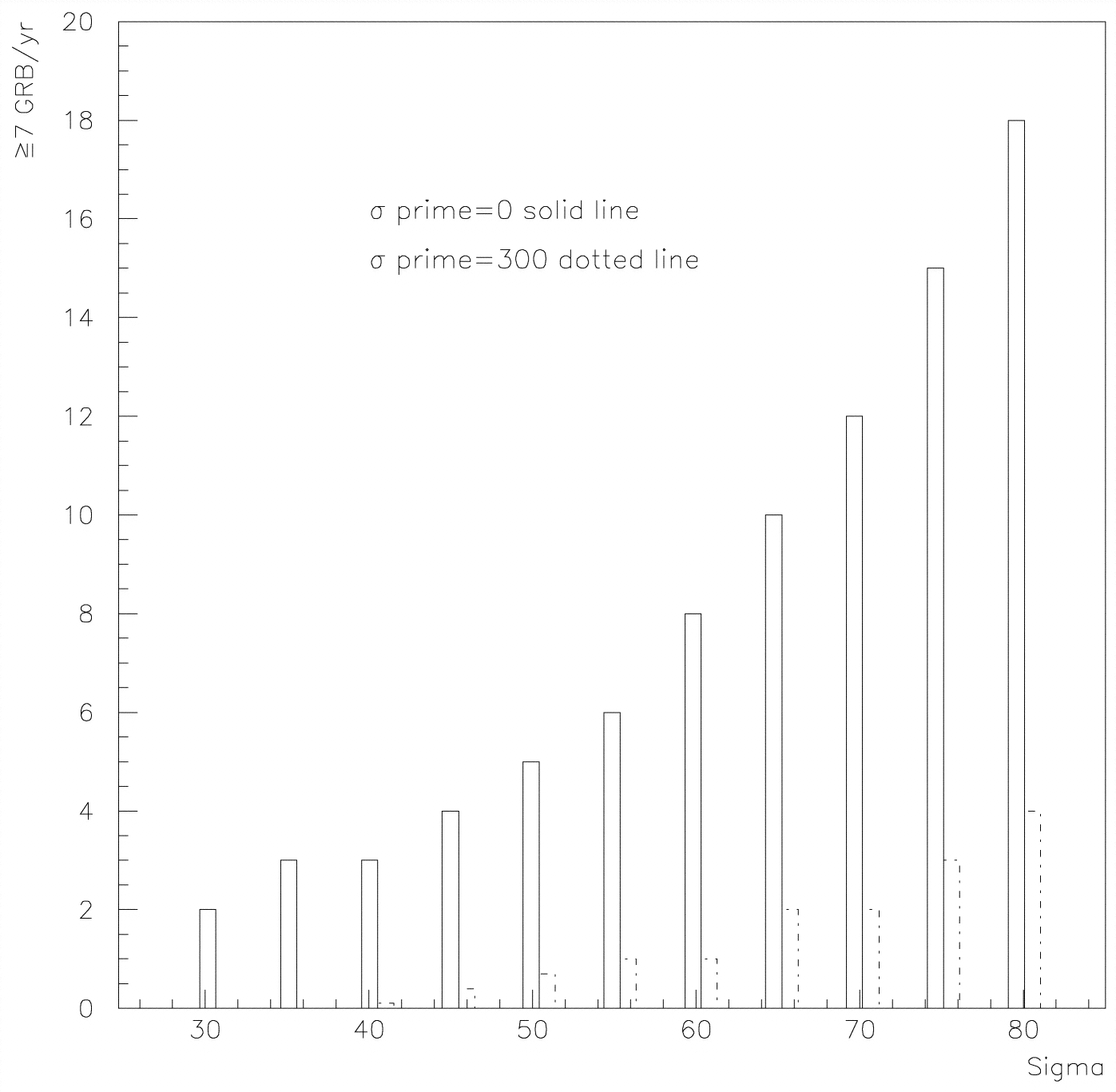 Yearly rate of individual neutrino bursts with more than seven events in a detector with a 1 km2 effective area as a function of the range of the bulk Lorentz factor γ. The range is assumed to be Gaussian with width σ below the average of 300 and σ﹩\arcmin﹩ above. The latter is taken to be either 0 or 300.