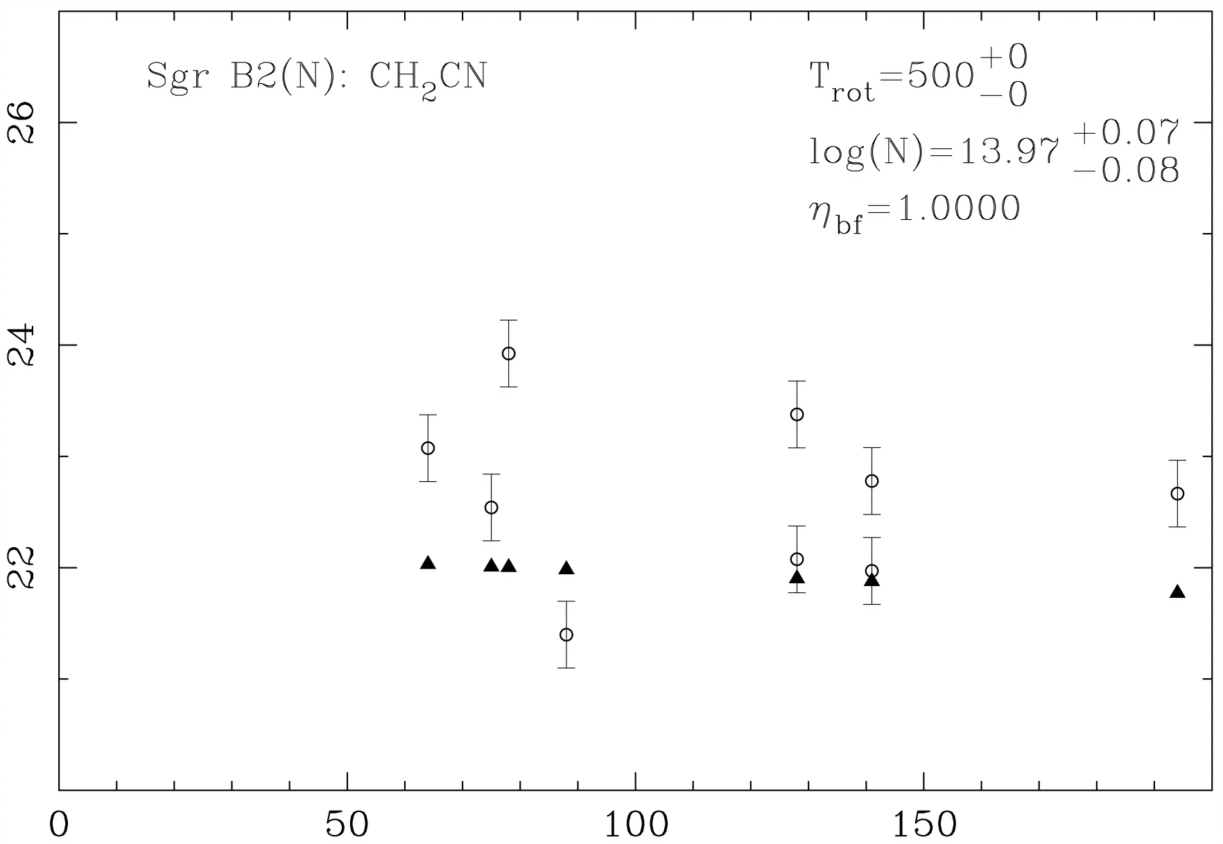 In these rotation diagrams the observed line intensities are plotted (circles) together with the intensities resulting from the best‐fit model (triangles). The error bars indicate 30% pointing and calibration uncertainty. Transitions suspected to be significantly blended with other species have been excluded.