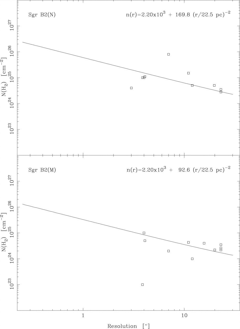 H2 column density as a function of angular resolution for Sgr B2(N) and Sgr B2(M), respectively. Observed values (Table 4) have been indicated with squares. The curves were calculated by convolving the density distribution (eq. [14]) with a Gaussian corresponding to the angular resolution