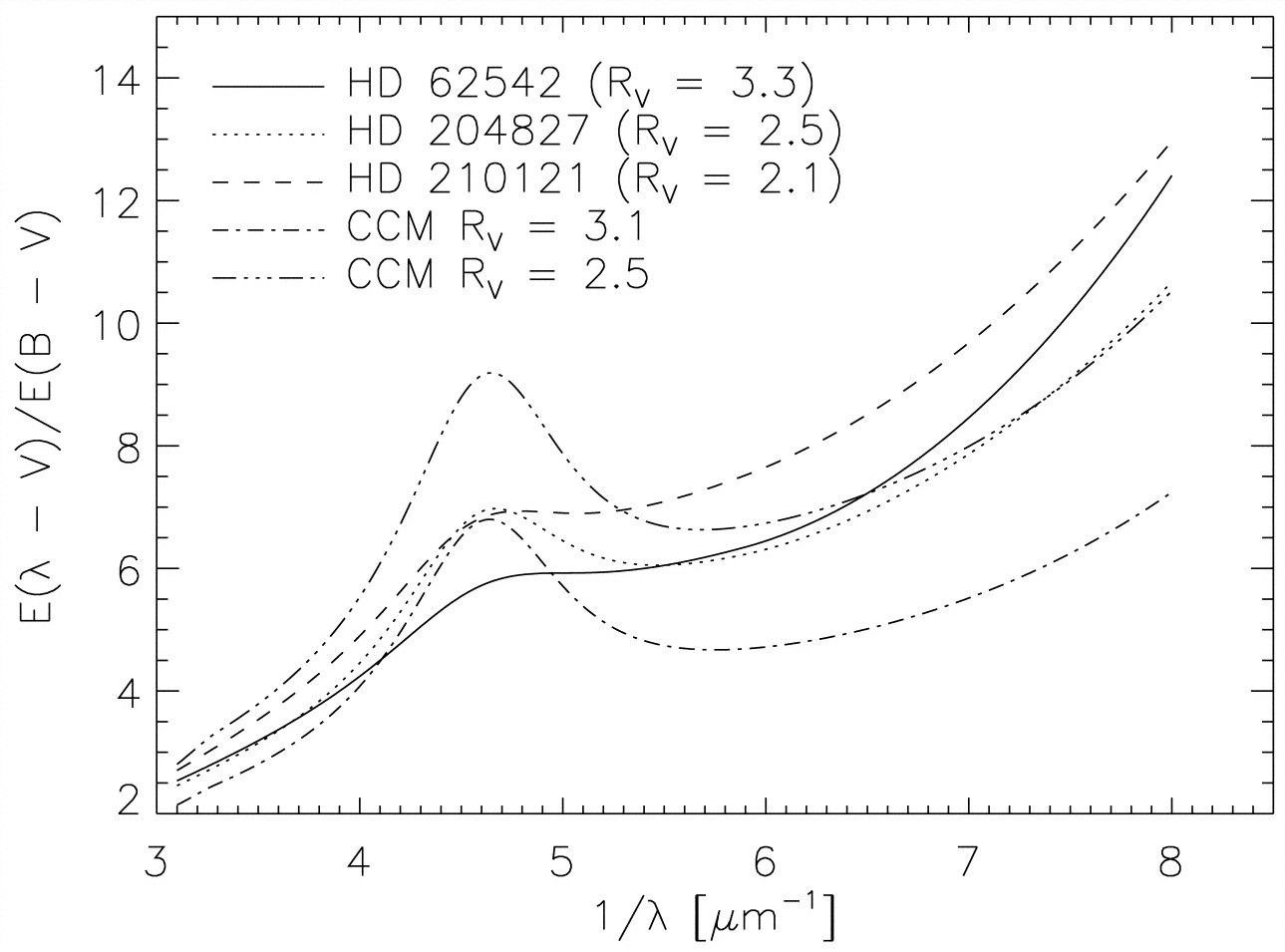 Sight lines in the Galaxy showing anomalous extinction. CCM curves for RV values of 2.5 and 3.1 are plotted for comparison.