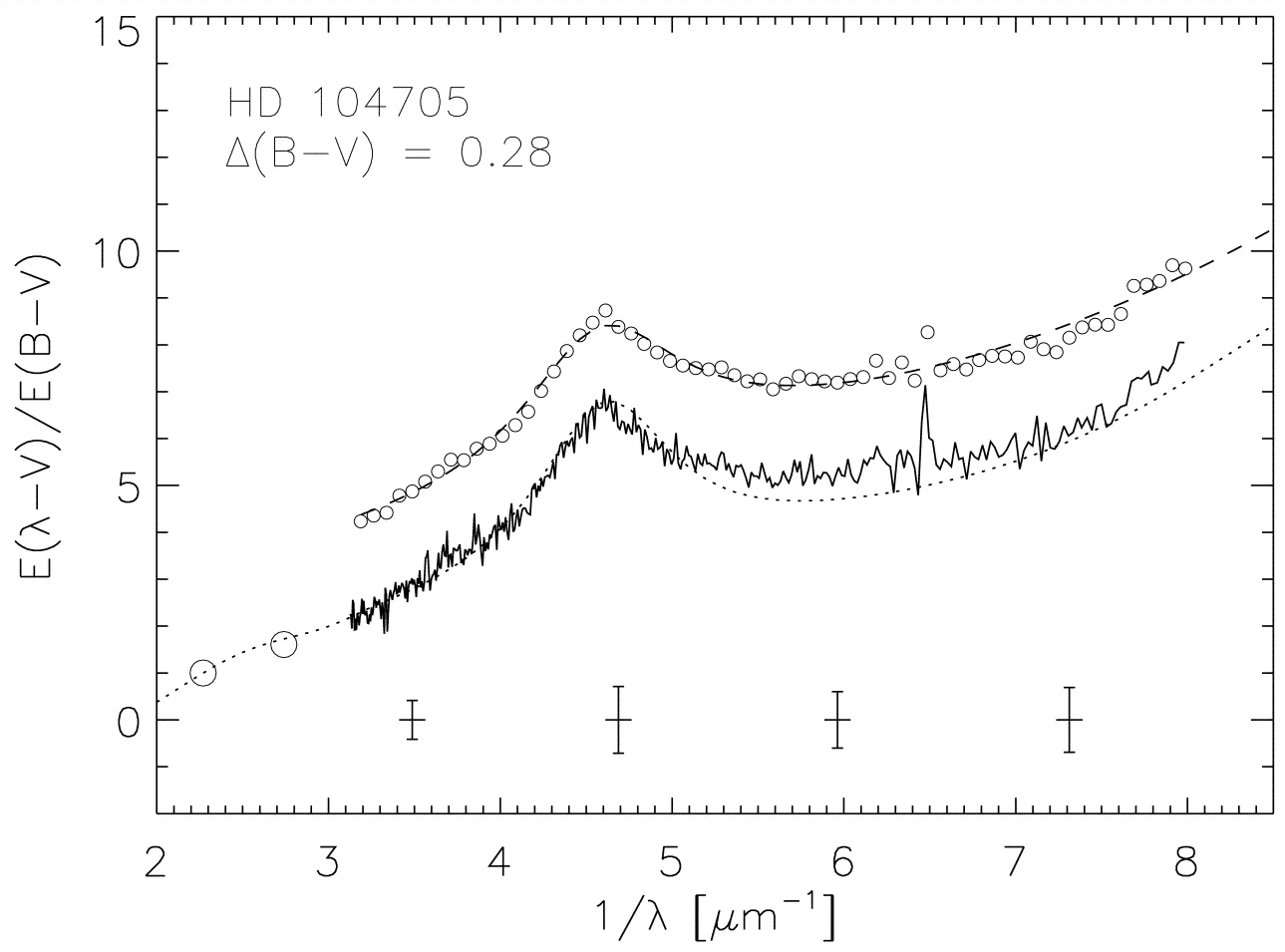 Extinction curves for the stars in the sample. Each panel shows the calculated extinction curve (solid line), smoothed curve (small open circles, offset two units for clarity), FM90 fit (dashed line), CCM relation for ﹩R_{V}=3.1﹩ (dotted line), and extinction in the U and B bands (large open circles). One sigma error bars for the unsmoothed extinction curve are plotted at four representative wavelengths. The value of Δ(B−V) between the reddened and comparison stars is listed.