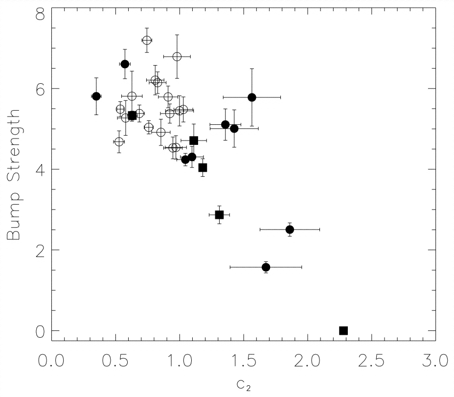 Steepness of the far‐UV extinction (c2) plotted against bump strength (πc3/2γ) for the stars in the SD region lying between ﹩l=325^{\circ }﹩ and 0° (filled circles) and for those of the rest of the sample (open circles). Also, plotted from upper left to lower right are average points (filled squares) for the Galaxy, LMC (outside LMC 2), LMC 2, and SMC (Misselt et al. 1999; Gordon & Clayton 1998).