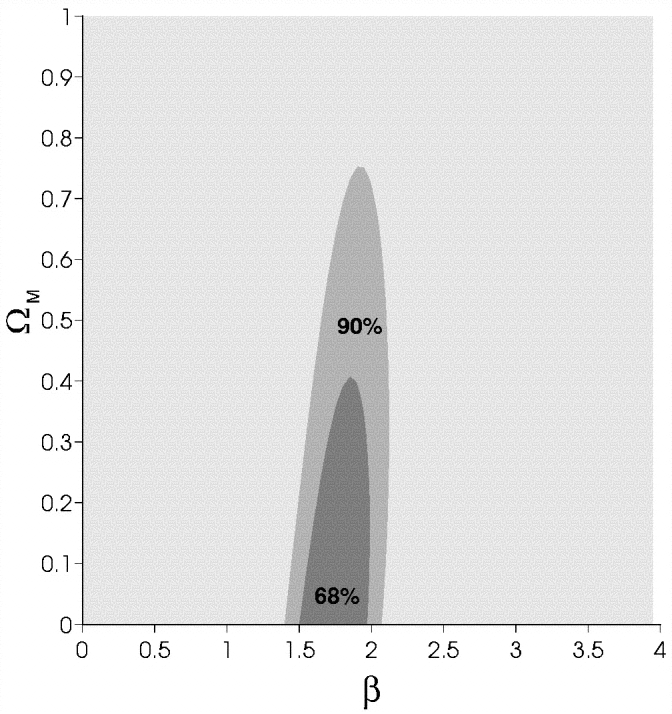 The 68% and 90% confidence intervals for β and ﹩\Omega _{m}﹩, where (a) ﹩\Omega _{\Lambda }=0﹩ (no cosmological constant) and (b) ﹩\Omega _{\Lambda }=1-\Omega _{m}﹩ (spatially flat universe)