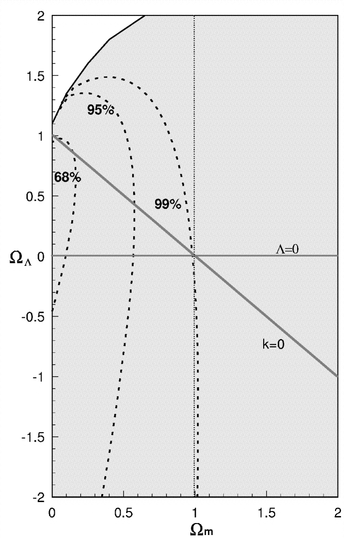 Projections of the 68%, 95%, and 99% confidence intervals onto either axis (﹩\Omega _{m}﹩ or ﹩\Omega _{\Lambda }﹩) indicate the probability associated with the range in that one parameter, independent of all other parameter choices (one‐dimensional).