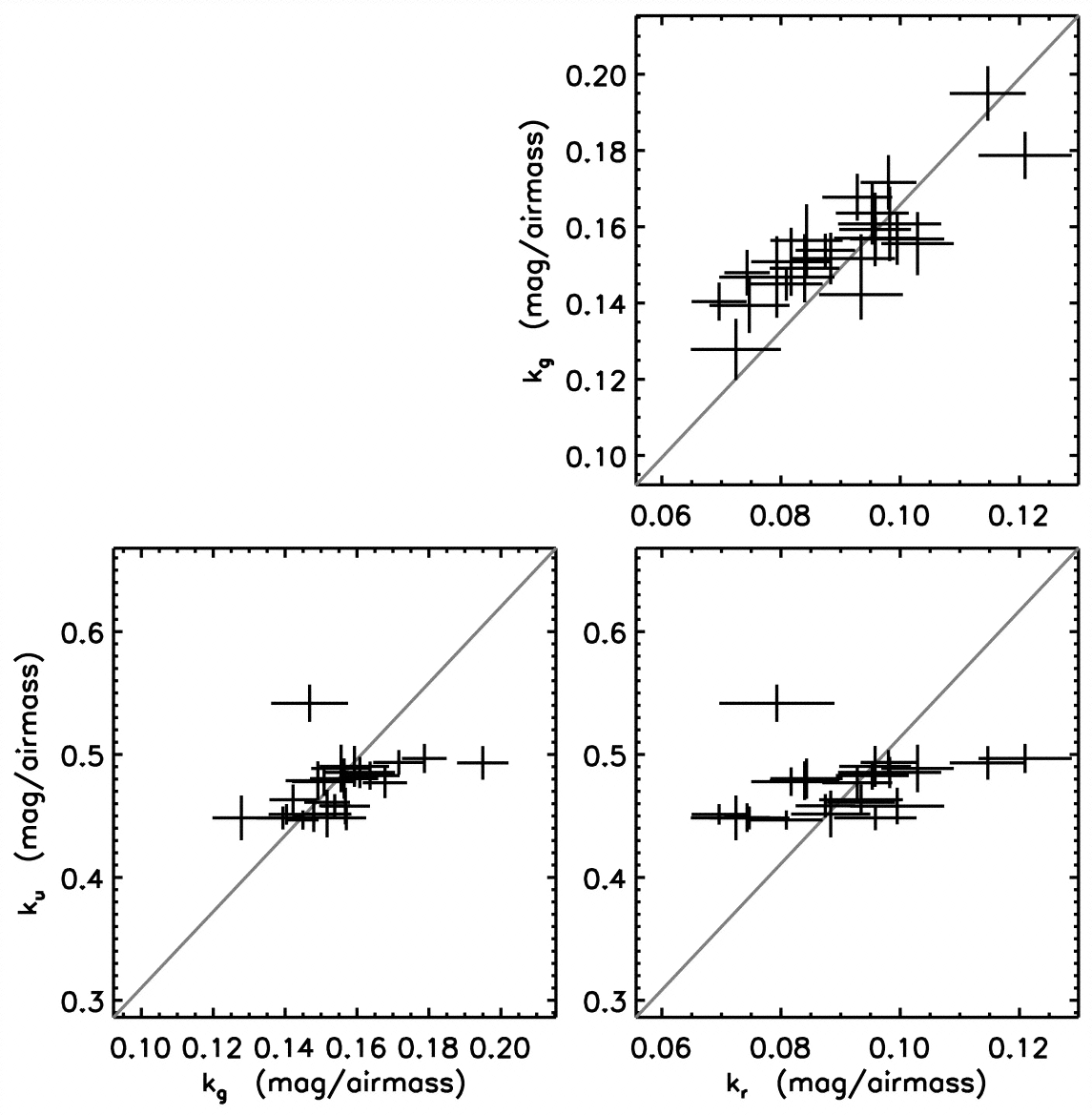 Atmospheric extinction coefficients [ku, kg, kr] in the [u′, g′, r′ ] bandpasses, for most photometric nights between MJD 51840 and 51970, plotted against one another. The diagonal lines show the relationship (ku ∝ kg ∝ kr) expected if atmospheric extinction is due to a single atmospheric component.