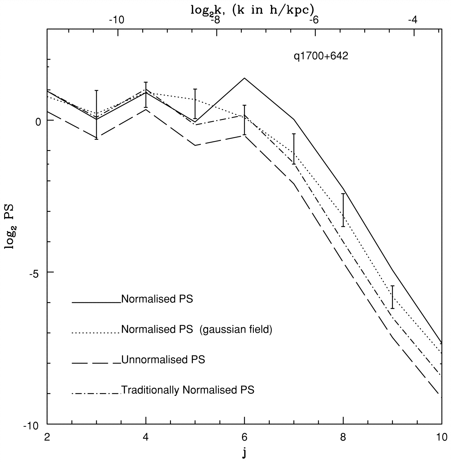Transmission power spectrum Pj (solid line) for the real sample Q1700+642, calculated by estimator eq. (41), and the power spectrum ﹩P^{t}_{j}﹩ (dashed line) calculated by eq. (46). The dot‐dashed line represents the power spectrum normalized by the traditional method. The dotted line is the power spectrum by eq. (46) for the phase‐randomized field. The error bar is given by the maximum and minimum of 20 realizations. The scale j corresponds to ﹩2^{11-j}( 34) ﹩ h−1 kpc.