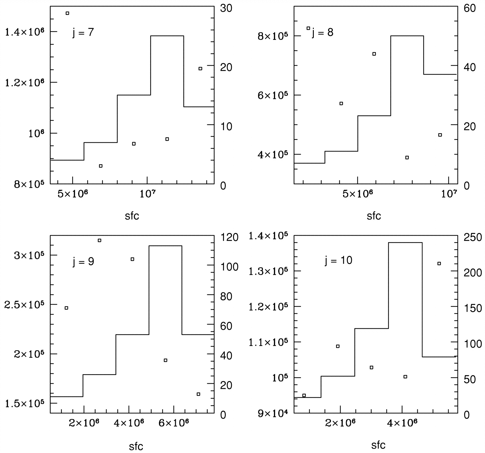WFC‐SFC anticorrelation for a real sample of the Q1700+642 Lyα forests. The histogram shows the number distribution of the SFCs. Their values can be read from the right‐hand y‐axis. The squares show the average value of the WFCs in each SFC bin. Their values can be read from the left‐hand y‐axis. The scale j corresponds to ﹩2^{11-j}( 34) ﹩ h−1 kpc.