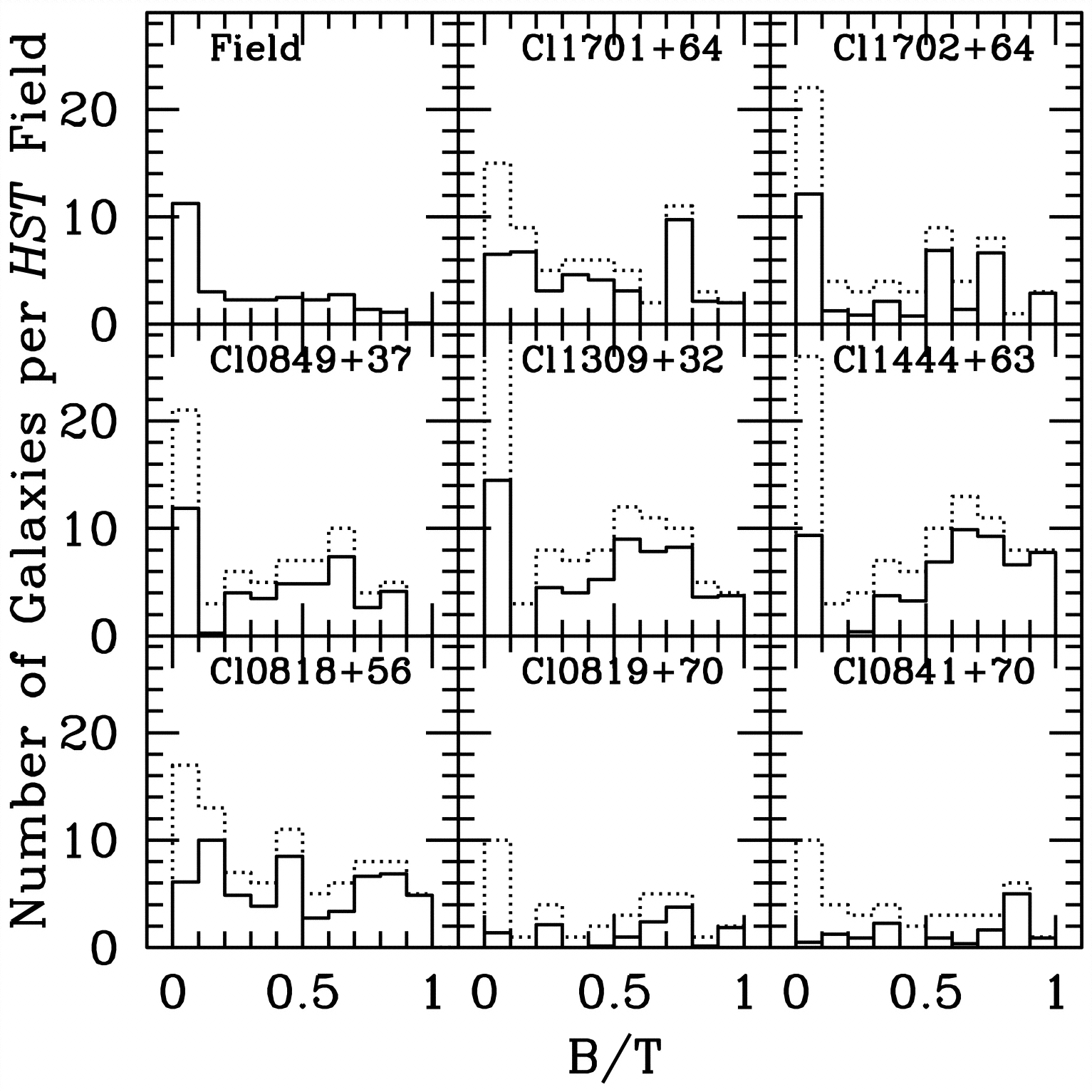 Left: The distribution of B/T in the eight low‐﹩L_{\mathrm{X}\,}﹩ clusters and the mean distribution of the MDS field sample. For the eight clusters, the dotted histograms show the distribution of all galaxies, and the solid histograms are corrected for foreground and background contamination by subtracting the field distribution. Right: The B/T distributions of the high‐﹩L_{\mathrm{X}\,}﹩ clusters.