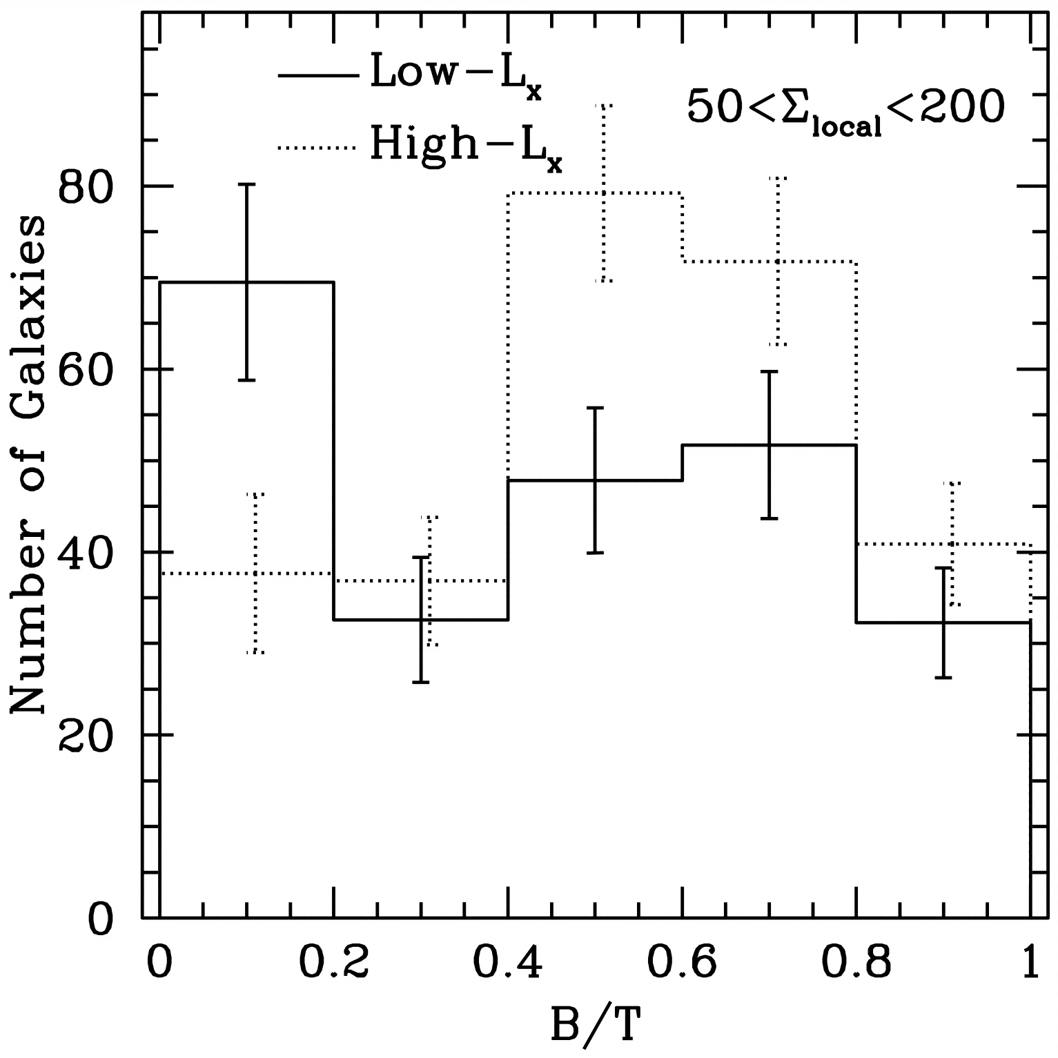 B/T distribution for galaxies with ﹩\Sigma _{\mathrm{local}\,}=50﹩–200 ﹩h^{2}_{50}﹩ Mpc﹩^{-2}﹩. The solid and dotted histograms correspond to the low‐﹩L_{\mathrm{X}\,}﹩ and high‐﹩L_{\mathrm{X}\,}﹩ samples, respectively.