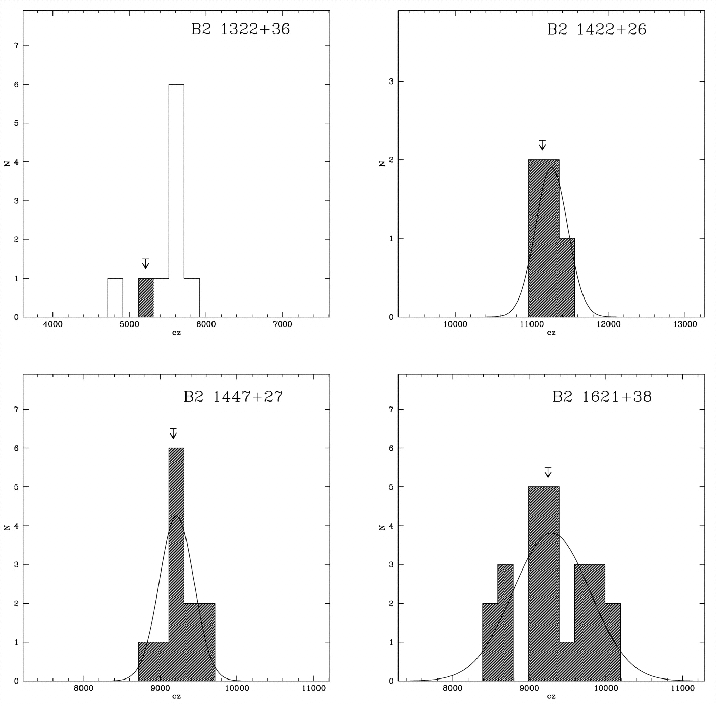 Velocity histograms for the 25 sources investigated. For systems consisting of more than one galaxy, a Gaussian with mean and standard deviation corresponding to the derived systemic velocity (CBI) and dispersion (SBI) is also plotted. Unshaded portions of the histograms represent foreground and background galaxies. In the cases of B2 1322+36 and 3C 305, the radio galaxy lies just outside of the 3 σ–clipped group. For these two fields, the histogram for the adjacent group is left unshaded, while the radio galaxy is shaded. In all of the histograms, the velocity of the radio galaxy is marked with an arrow.