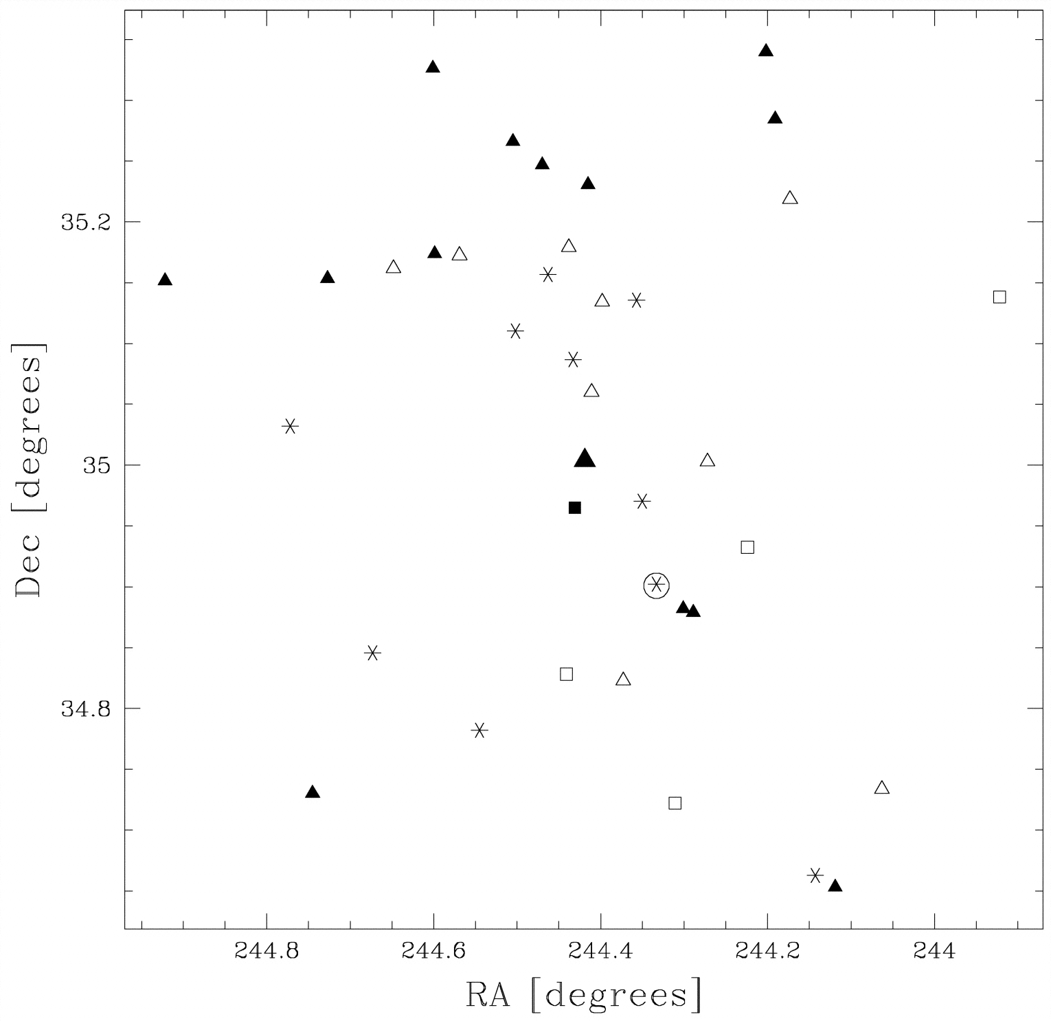 Galaxy distribution for 1615+351. The symbols represent velocity ranges for the galaxies: filled squares, cz < 8410 km s−1; filled triangles, 8410 km s−1 ≤ cz < 8994 km s−1; asterisks, 8994 km s−1 ≤ cz ≤ 9578 km s−1; open triangles, 9578 km s−1 < cz ≤ 10,162 km s−1; open squares, cz > 10,162 km s−1. The radio galaxy (NGC 6109) is at the center of the field and is denoted by a larger symbol. Its velocity is 8979 km s−1. The brightest galaxy in the field (NGC 6107) has been circled; it is 0.3 mag brighter than the radio galaxy and has a velocity of 9399 km s−1.
