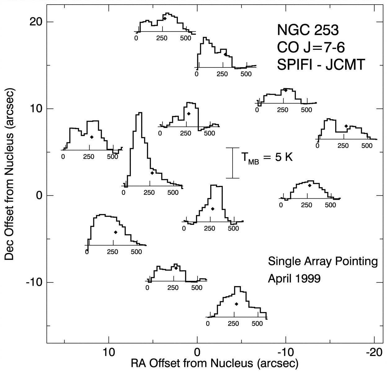 Shows CO ﹩J=7\rightarrow 6﹩ spectra toward the nucleus of NGC 253. The (0, 0) position is at the IR nucleus at ﹩\mathrm{R.A}\,.=0﹩h45m06﹩\fs﹩0, ﹩\mathrm{decl}\,.=-25^{\circ }﹩33﹩\arcmin﹩40﹩\arcsec﹩ (B1950), and the beam size is 11﹩\arcsec﹩.