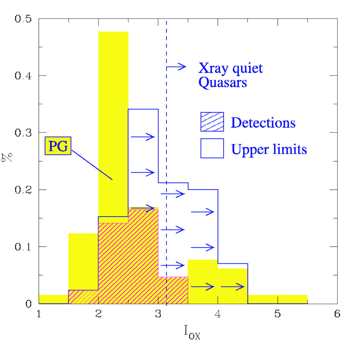 Optical–to–X‐ray ratio as inferred from ROSAT observations for the color‐selected PG quasars (shaded histogram) and the sample of R01. ﹩I_{\mathrm{OX}\,}﹩ is a logarithmic measure of the ratio between optical (B band) and soft X‐ray flux.