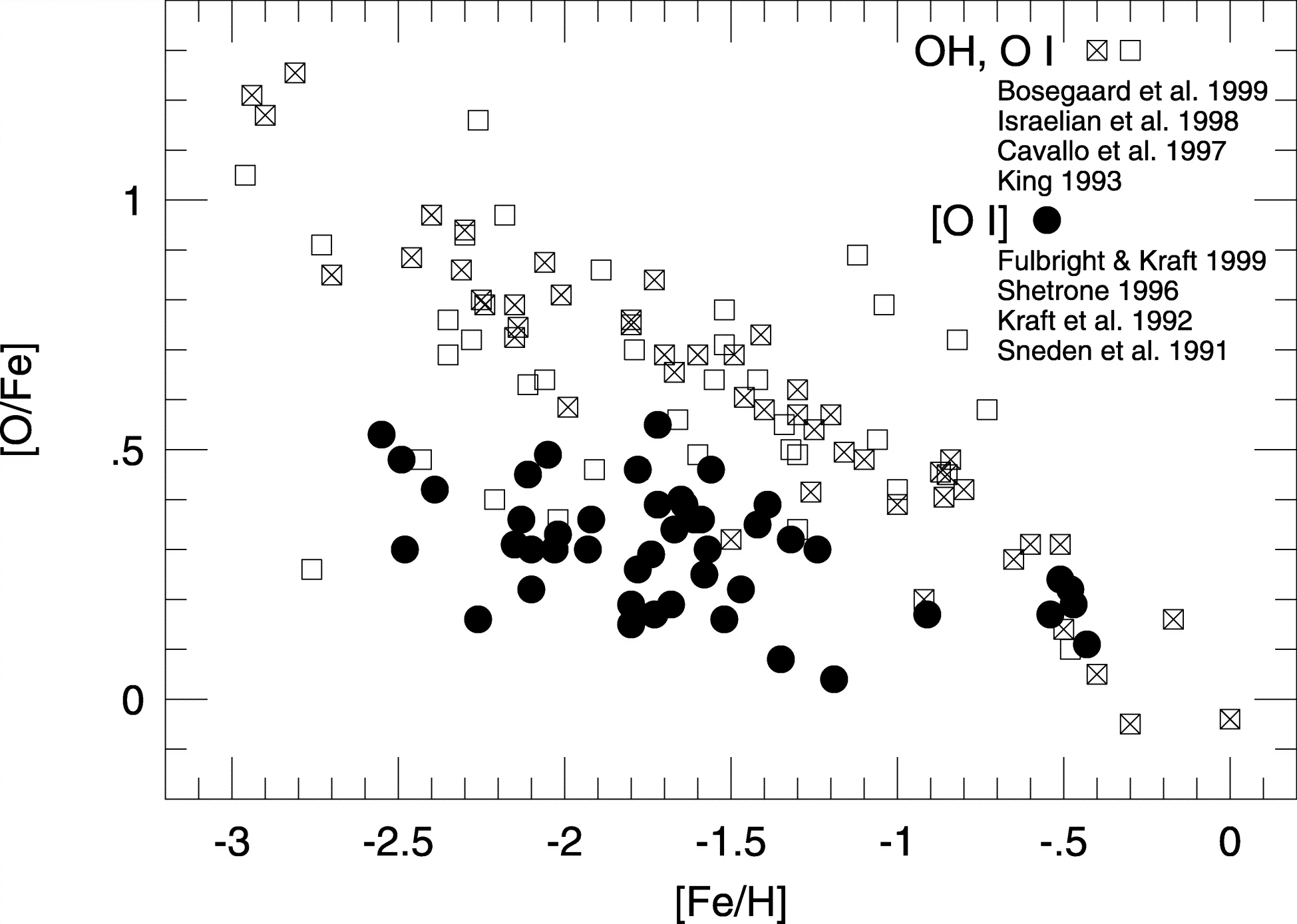 Sample oxygen abundances derived by previous studies to demonstrate the systematic difference observed between the forbidden [O I] lines and the permitted O I and molecular OH lines.
