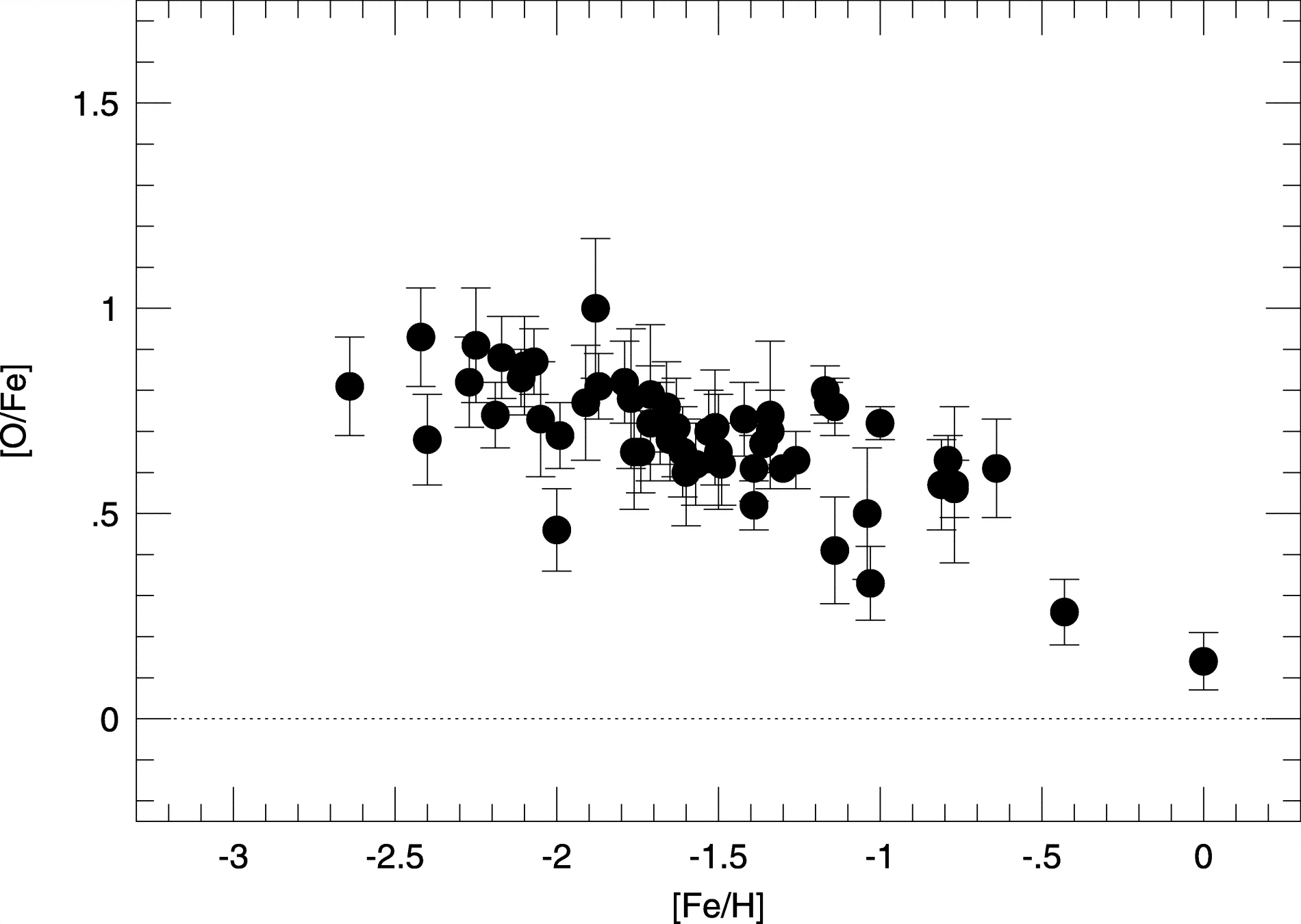 [O/Fe] vs. [Fe/H] diagram for the ad hoc scale. Because the two oxygen indicators were forced to agree on this scale, each star is indicated by a single filled circle. The error bars are those derived for the forbidden lines, but the values derived for the permitted lines are similar.