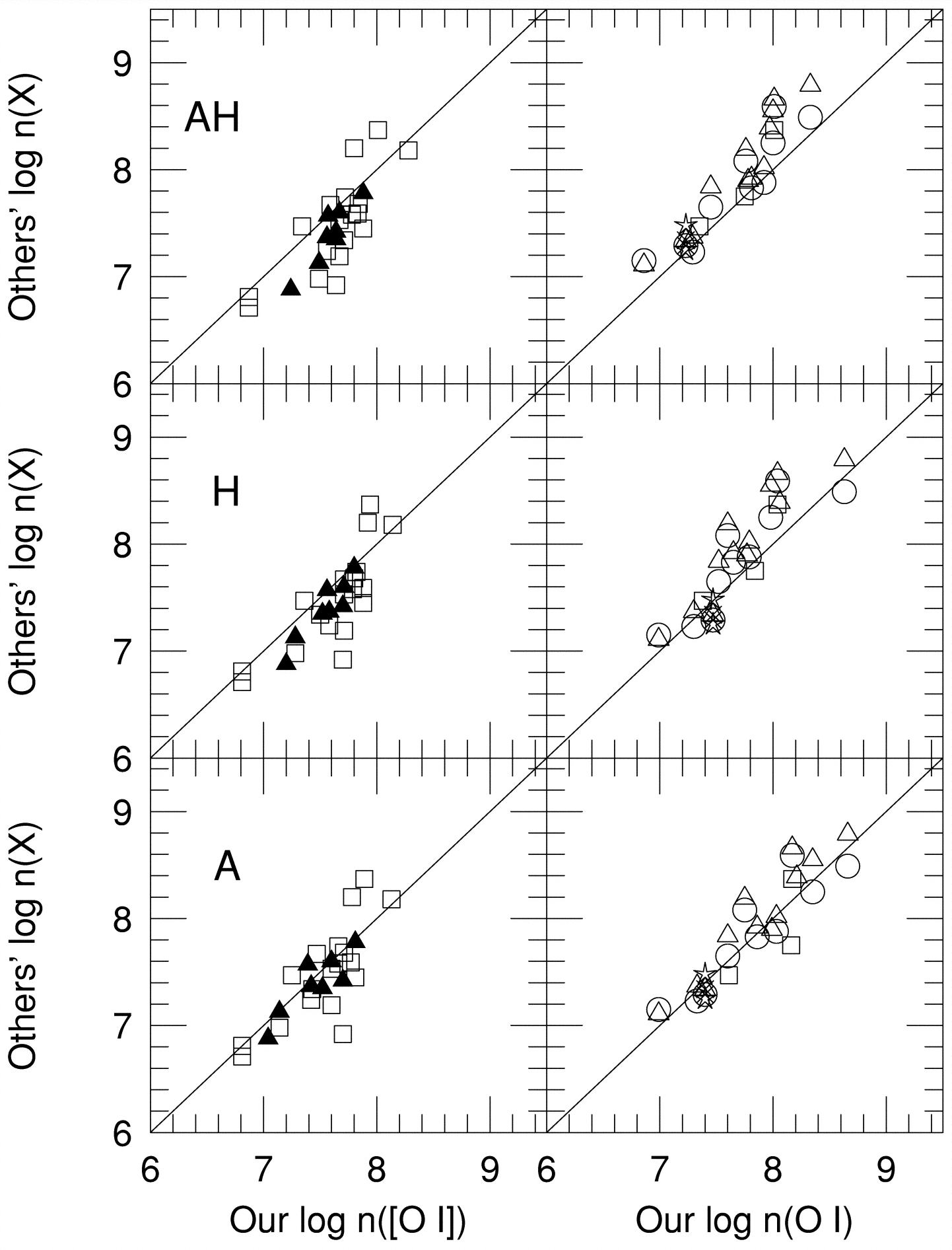 Comparisons between the oxygen abundances derived here and in other works. Each row represents either the Alsono (A), Houdashelt (H), or ad hoc (AH) scales, while the left and right columns are for the forbidden and permitted line abundances, respectively. The data are from Carretta et al. (2000; squares), Shetrone (1996; solid triangles), Mishenina et al. (2000; circles), and Cavallo et al. (1997; open triangles). The stars represent the Israelian et al. (1998) OH and Israelian et al. (2001) O I abundances for BD +23°3130.