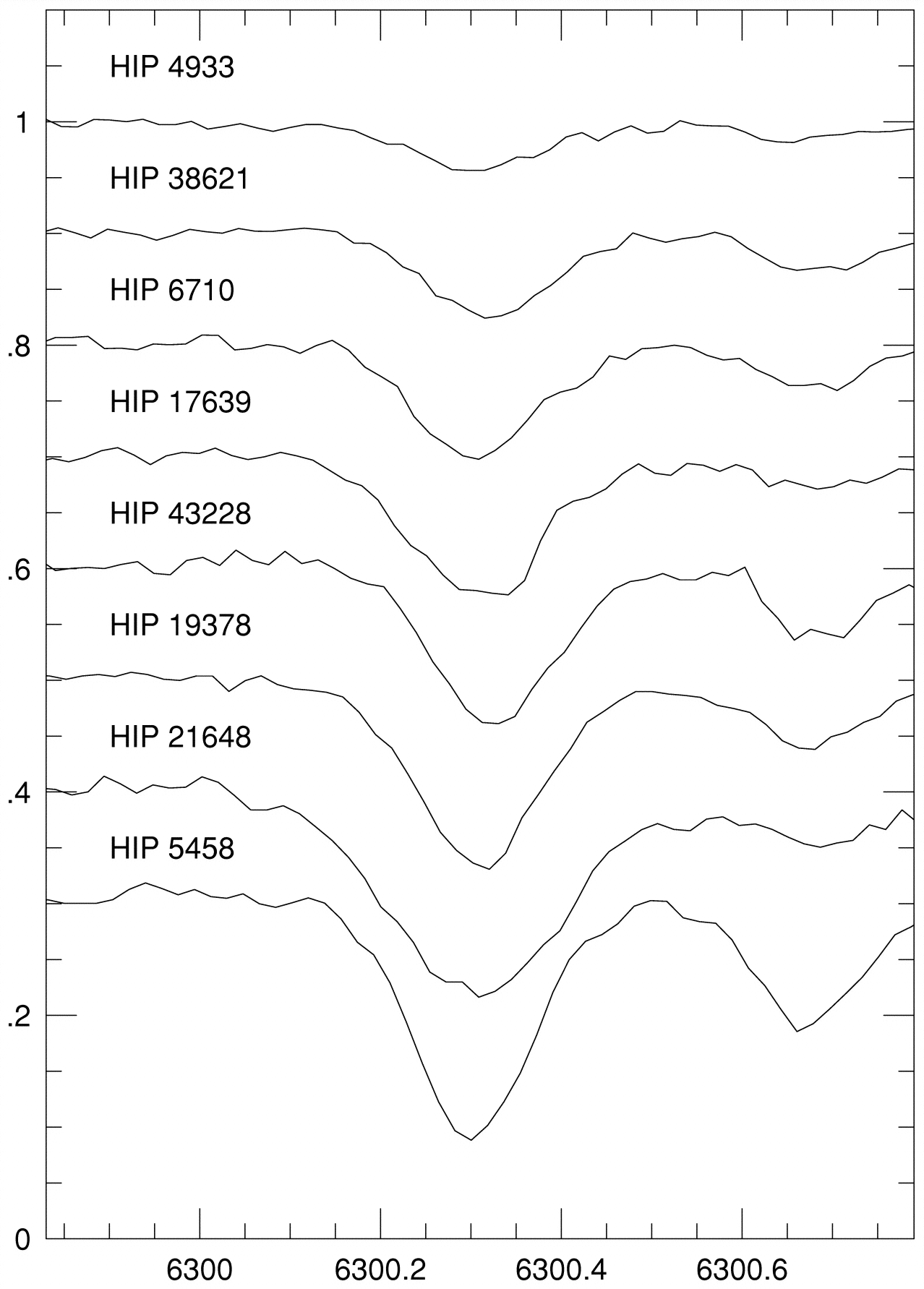 The 6300.31 Å region for eight giants. All are on the same scale, but shifted vertically for clarity. None of the lines here show any sign of emission features.