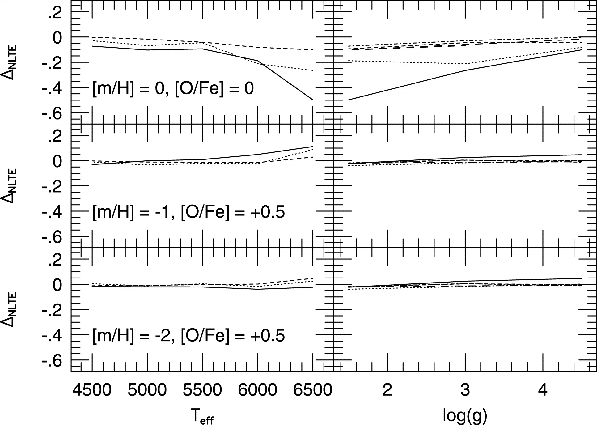 Difference of the Takeda et al. NLTE correction minus the Gratton et al. correction, assuming the same O I line strength for the 7772 Å O I line. In the left column, the solid, dotted, and short‐dashed lines are for ﹩\mathrm{log}\,g=1.5﹩, 3.0, and 4.5, respectively. In the right column, the solid, dotted, short‐dashed, long‐dashed, and dotted‐dashed lines are for ﹩T_{\mathrm{eff}\,}=6500﹩, 6000, 5500, 5000, and 4500 K, respectively. Except for hot low‐gravity stars, the two corrections are similar.