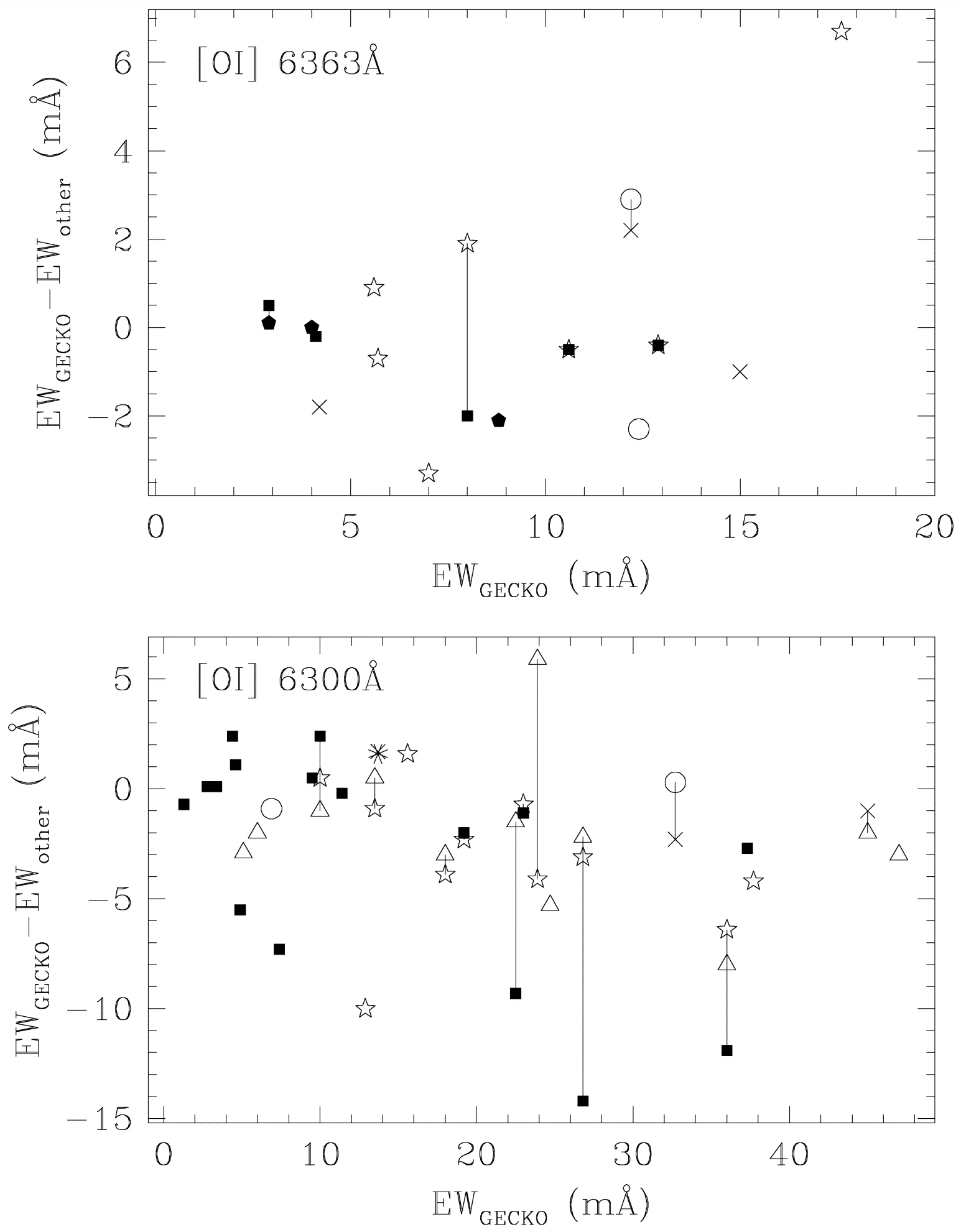 EW comparison of Gratton et al. (2000; filled squares), Barbuy (1988; open triangles), Gratton & Ortolani (1986; asterisks), Sneden et al. (1991; open circles), Shetrone (1996; crosses), Kraft et al. (1992; stars), and Takeda et al. (2000; filled pentagons). Solid lines connect independent measurements of the same star.