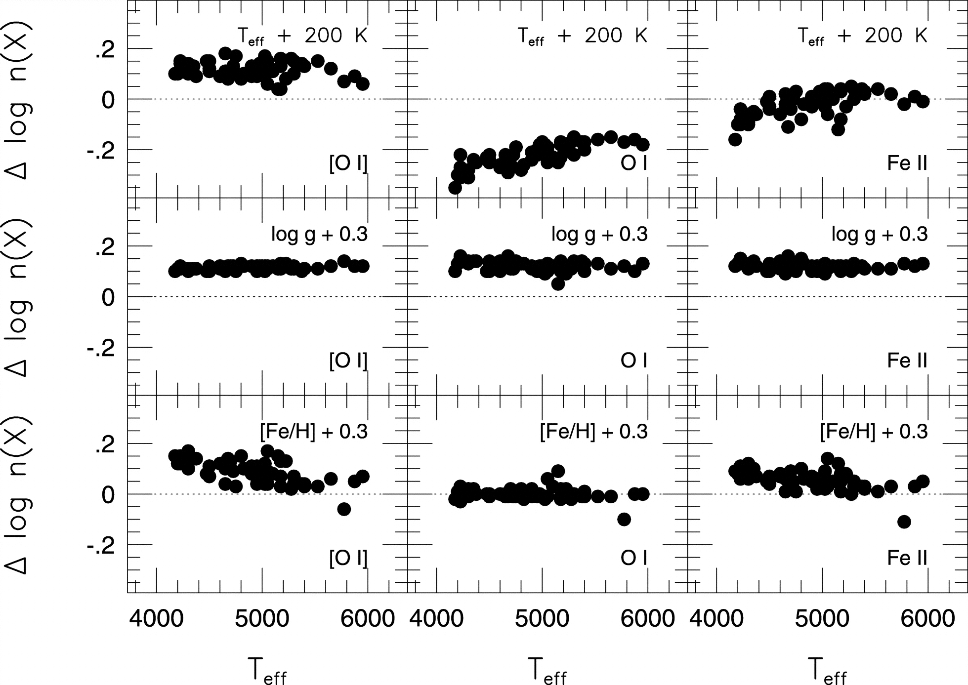 Effect of a specific change in the stellar parameter (each row) on the resulting abundance for each indicator (columns) plotted as a function of Teff. Each filled circle is an individual star in this work.