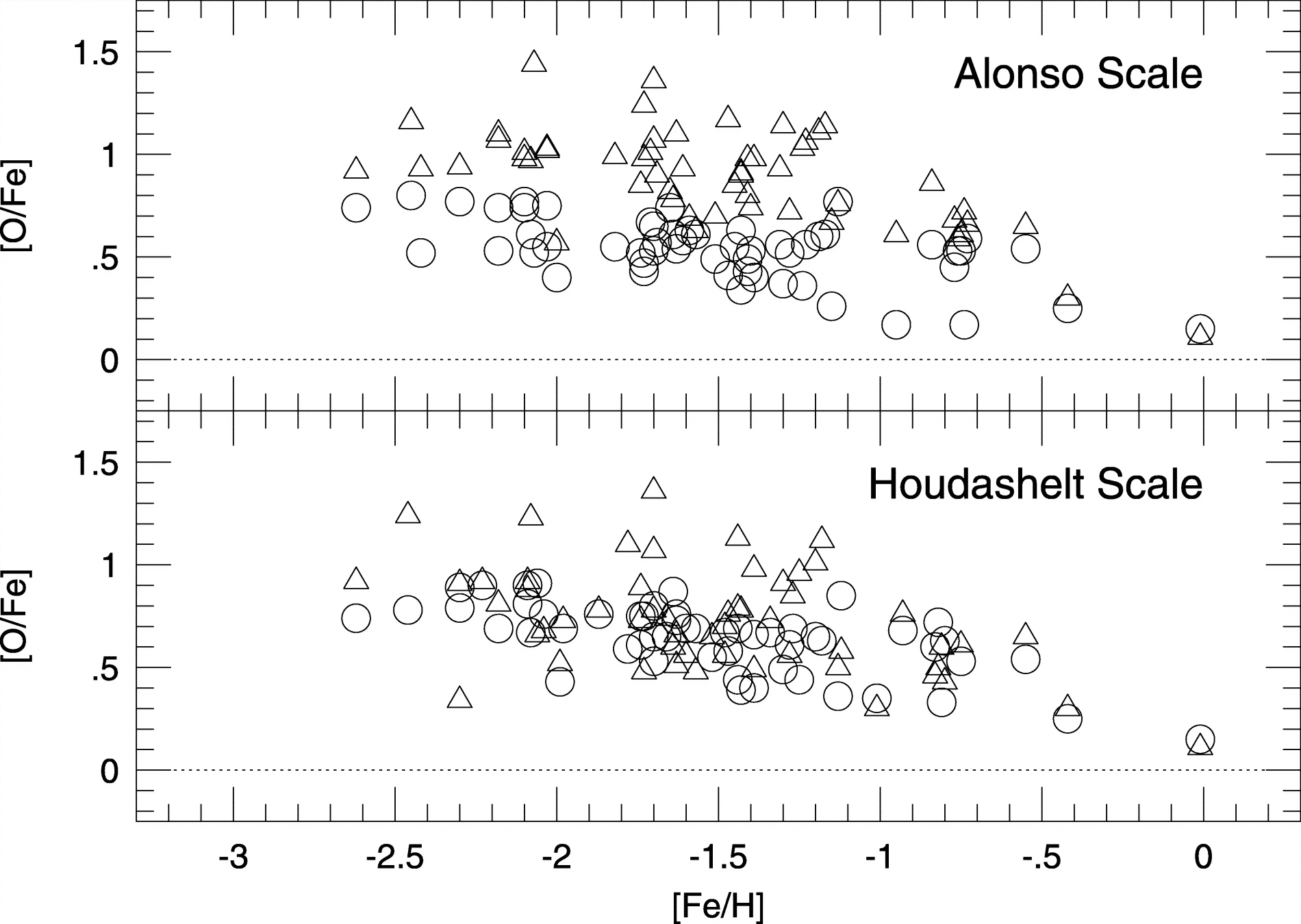 Plot of the [O/Fe] vs. [Fe/H] values derived from the permitted (triangles) and forbidden (circles) lines. Error bars have been omitted for clarity. Both temperature scales show a difference in the resulting oxygen abundances between the two indicators.