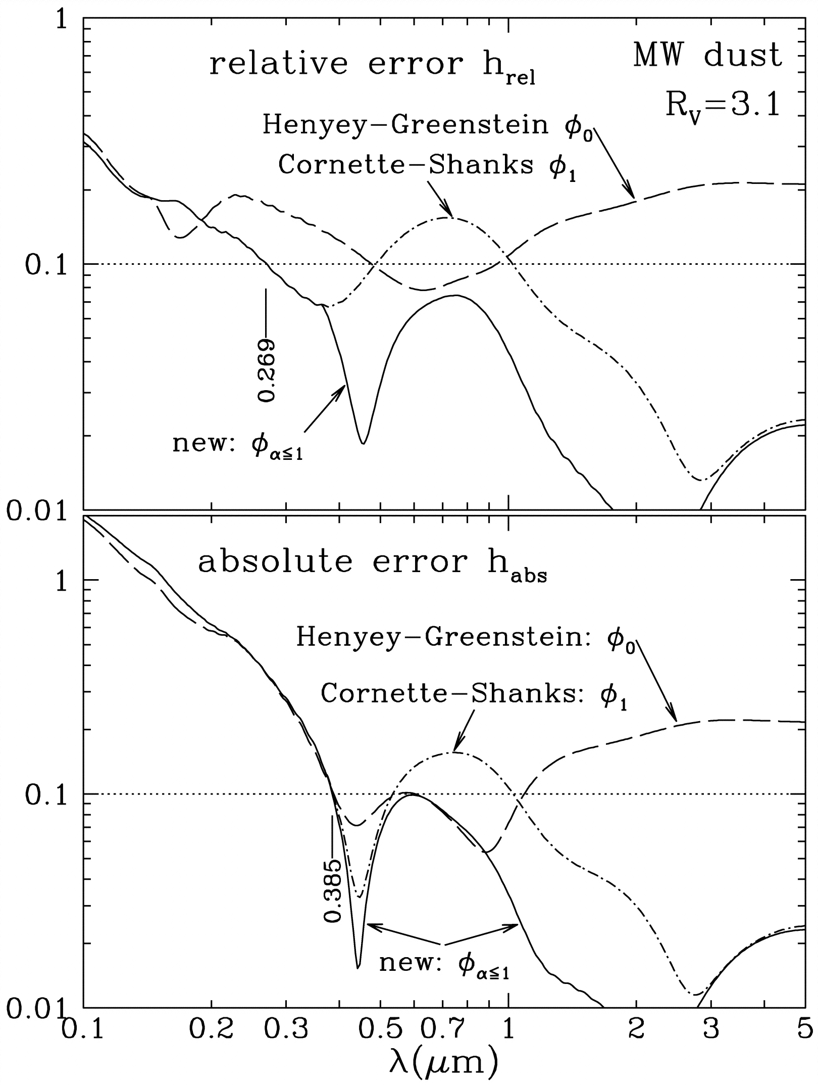 Normalized relative error ﹩h_{\mathrm{rel}\,}﹩ (eq. [6]) and absolute error ﹩h_{\mathrm{abs}\,}﹩ (eq. [7]) for the analytic phase functions ﹩\phi _{0}﹩, ﹩\phi _{1}﹩, and ﹩\phi _{\alpha \leq 1}﹩ applied to the WD01 grain model for MW dust with ﹩R_{V}=3.1﹩.