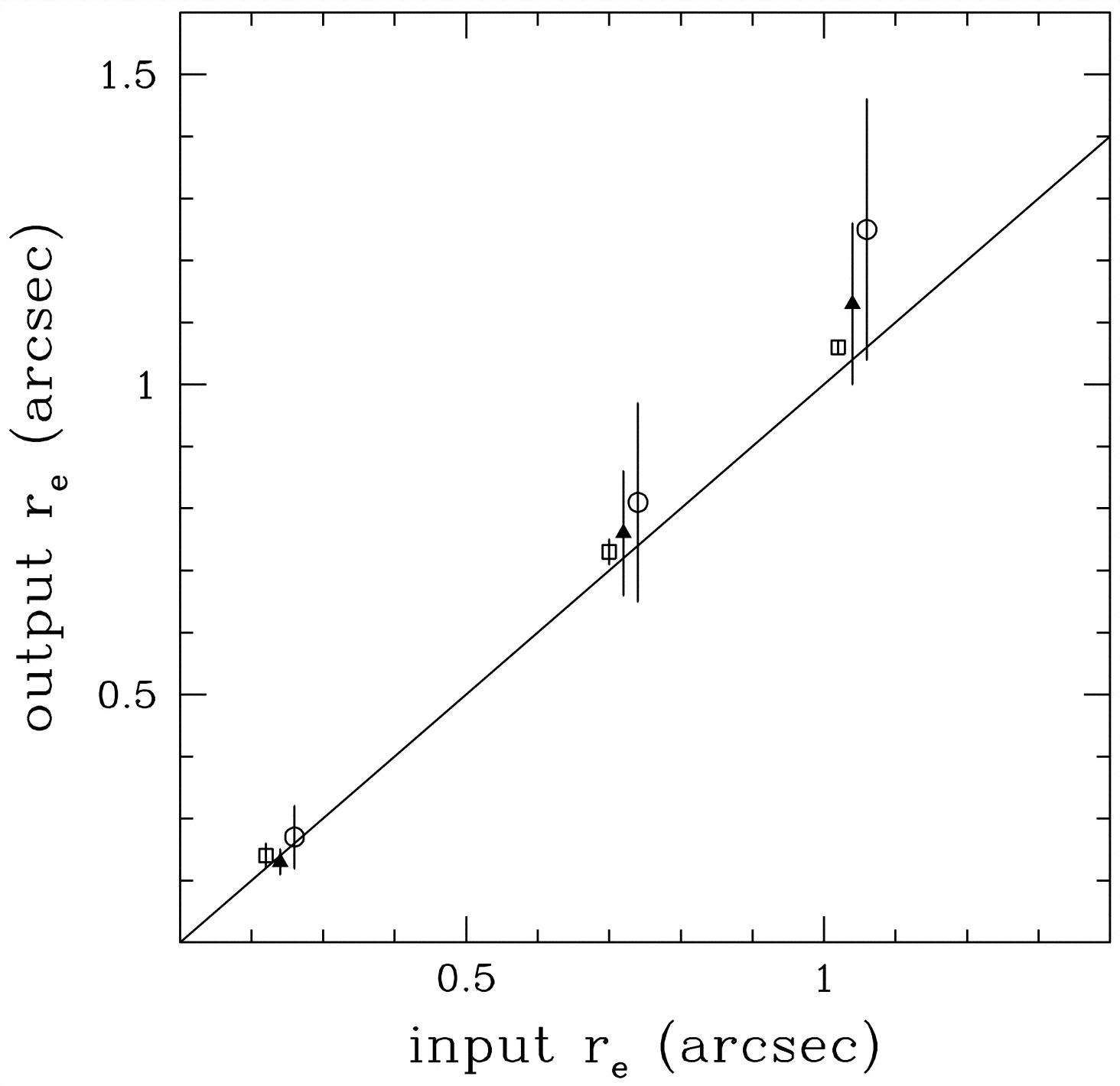 Plot of the re determined by our profile fitting vs. the input re for two sets of model elliptical galaxies. The open squares represent models with ﹩H_{160}=20.0﹩, the solid triangles those with ﹩H_{160}=22.0﹩, and the open circles those with ﹩H_{160}=24.0﹩. The points have been offset slightly in the horizontal direction for clarity. Error bars representing 1 σ are shown on each point.