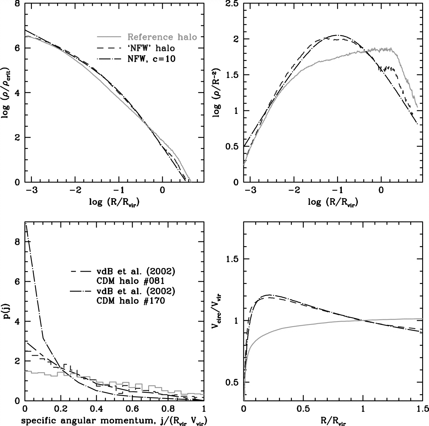 Same as Fig. 1, but here we attempt to reproduce a ﹩c=10﹩ NFW halo. Starting with our reference halo (§ 4.3), we reduced the amplitudes of the random velocities of particles that ended up roughly between 0.1﹩R_{\mathrm{vir}\,}﹩ and 1﹩R_{\mathrm{vir}\,}﹩. The SAM distribution of this halo (dashed histogram in the bottom left panel) is similar to that of N‐body halo 081 (van den Bosch et al. 2002). See § 4.4 for details.