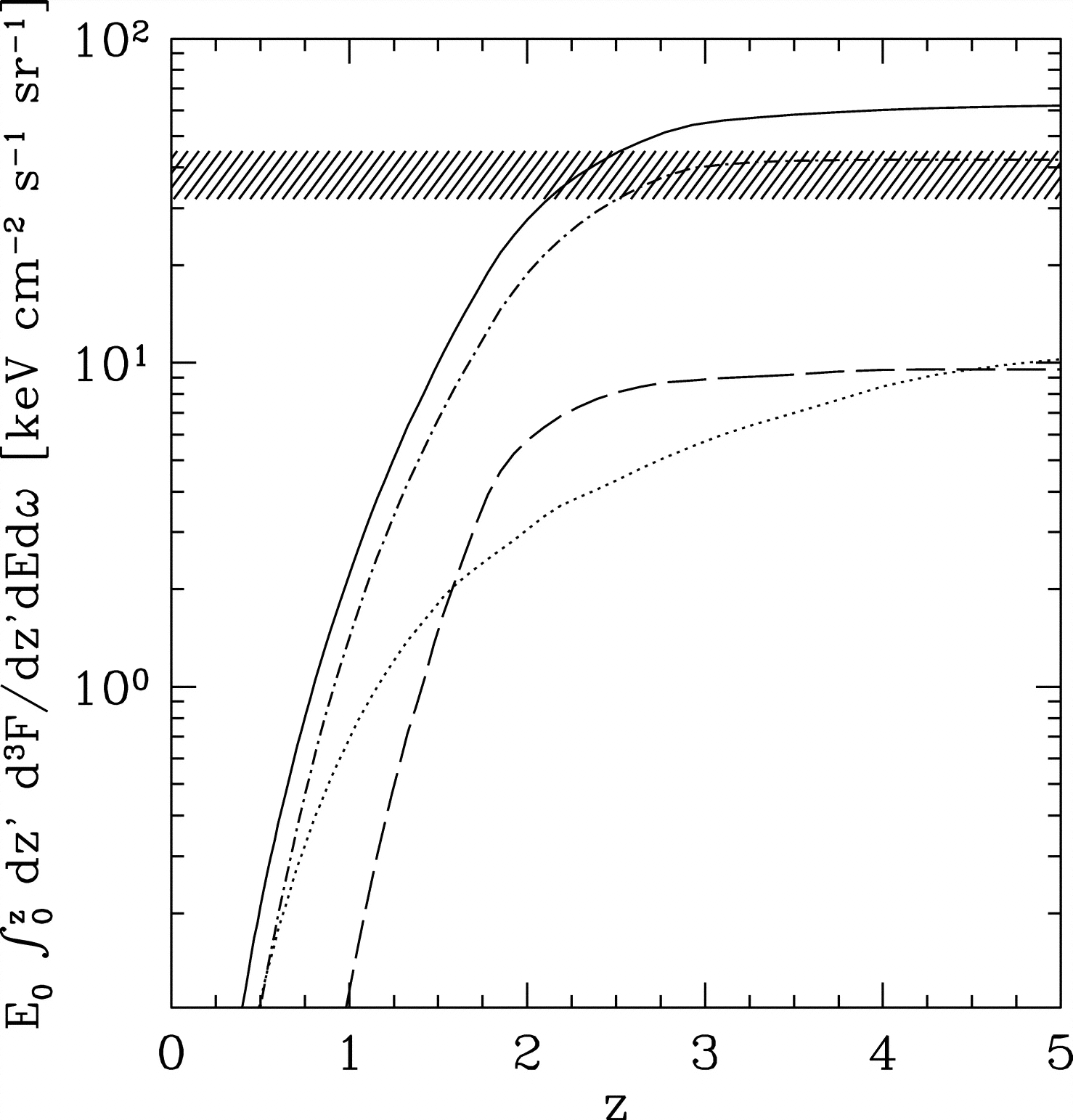Cumulative contribution (multiplied by the energy ﹩E_{0}﹩) to the predicted CXB at ﹩E_{0}=30﹩ keV, yielded by sources at progressively larger redshifts. The solid line shows the total CXB produced by sources with all luminosities. The other lines show the contributions of AGNs with luminosities LX (in units of ergs s−1, in the band 2–10 keV) in the ranges ﹩42< \mathrm{log}\,L_{\mathrm{X}\,}< 43.5﹩ (dotted line), ﹩43.5< \mathrm{log}\,L_{\mathrm{X}\,}< 44.5﹩ (dot‐dashed line), and ﹩44.5< \mathrm{log}\,L_{\mathrm{X}\,}﹩ (long‐dashed line). The shaded strip is the value 43 keV cm﹩^{-2}﹩ s﹩^{-1}﹩ sr﹩^{-1}﹩ measured by HEAO 1 A‐2 (Gruber et al. 1999).