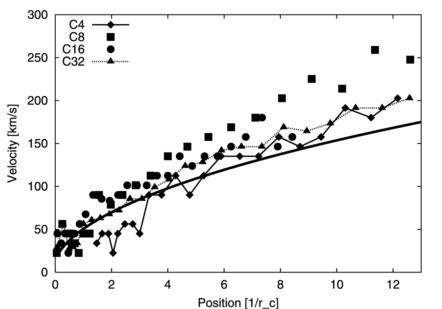 Velocity of the innermost fragment of a cloud is plotted vs. its distance from the original inner edge of the cloud. The clump of lowest resolution (C4) did not fragment, but did lose mass continuously in a tail. The different symbols refer to the number of cells in the radius of the original clump. For the clumps of highest and lowest resolution the data points have been connected with a line. The smooth continuous line corresponds to the expected velocity for an unfragmented clump according to eq. (13).