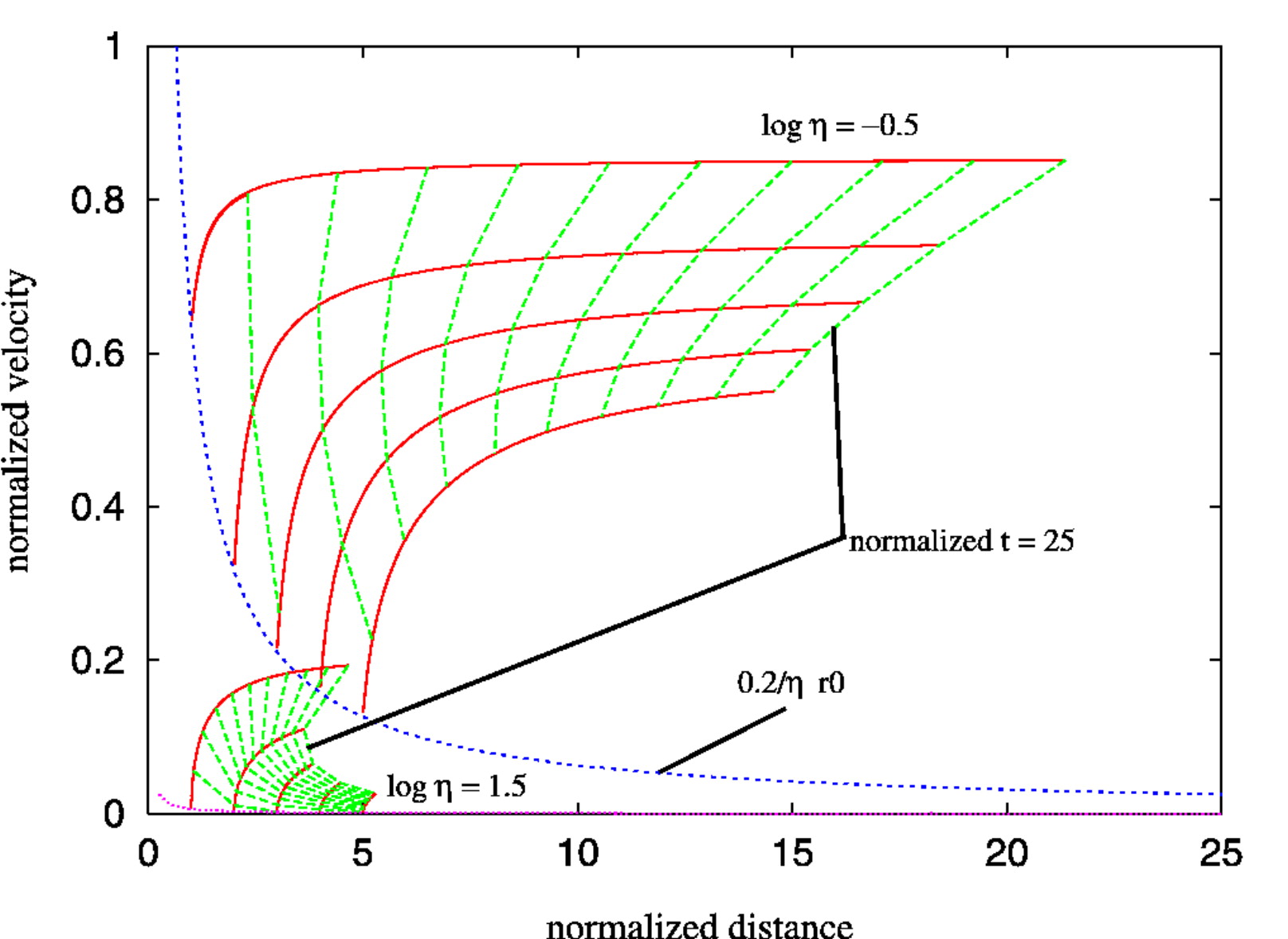 For two different values of η and five values of initial distances we have plotted the velocity of clumps as a function of normalized distance. The curves are connected among each other by isolines of normalized time. Given the time delay in the arrival of the global shock at the different positions, the initial isotime line does not include all clumps. The initial normalized internal cloud shock velocities where ﹩\overline{v}_{cs}=0.2( \eta \overline{r}_{0}) ^{-1}﹩.