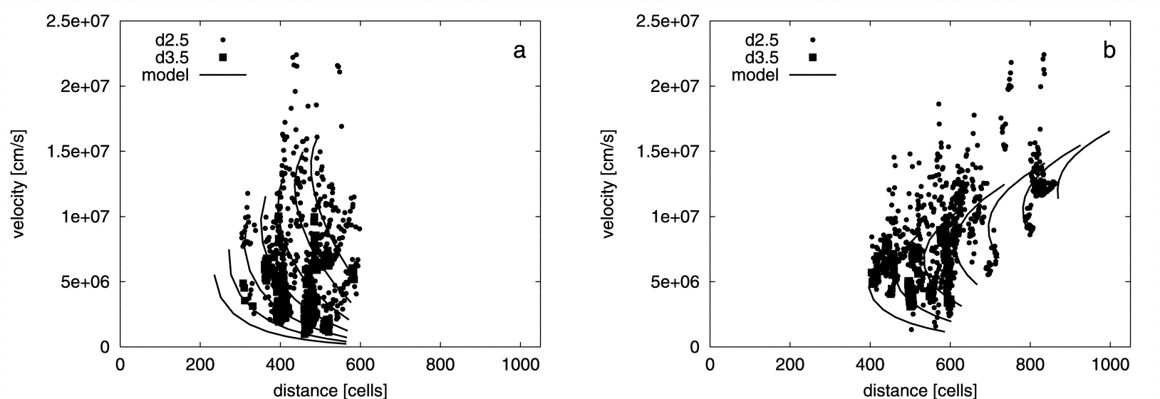 Scatter plots of velocity vs. distance from the central star are shown for RUN 2 with preexisting clouds at times of (a) 910 and (b) 1852 yr after the beginning of the fast stellar wind. Only the highest densities are shown, in order to compare the kinematics with the model calculations for the acceleration of the clump ensemble. The model is shown as points connected with solid lines. They encompass the range of values for initial distance and η appropriate to the simulation. The only clump that is outside the range predicted is that located at a distance of ≈750 cells and ﹩1.5\times 10^{7}﹩ cm s−1.