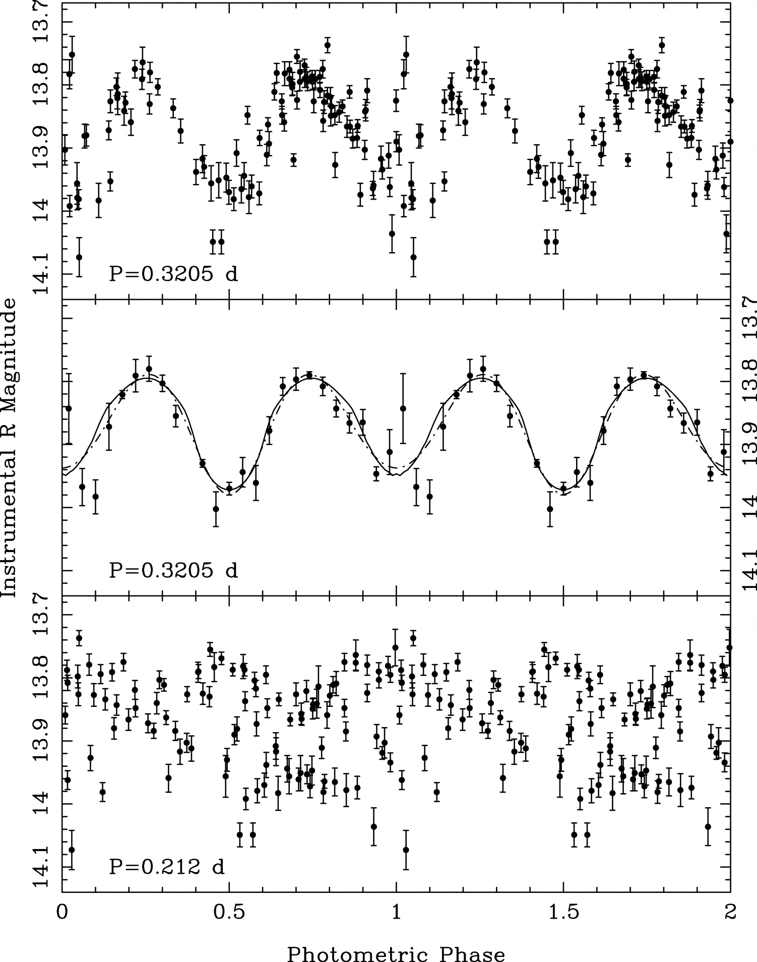 Top panel: Magellan light curve of J1650 phased on the photometric period of ﹩P=0.3205﹩ days. Middle panel: Phased light curve smoothed using 20 bins in phase, along with two representative ellipsoidal model fits (see Table 2 for model parameters). The solid line shows a model with an accretion that dominates the light (model A in Table 2), and the dot‐dashed line shows a model with no accretion disk (model B in Table 2). Bottom panel: Magellan light curve folded using the period of ﹩P=0.212﹩ days reported by SF02.