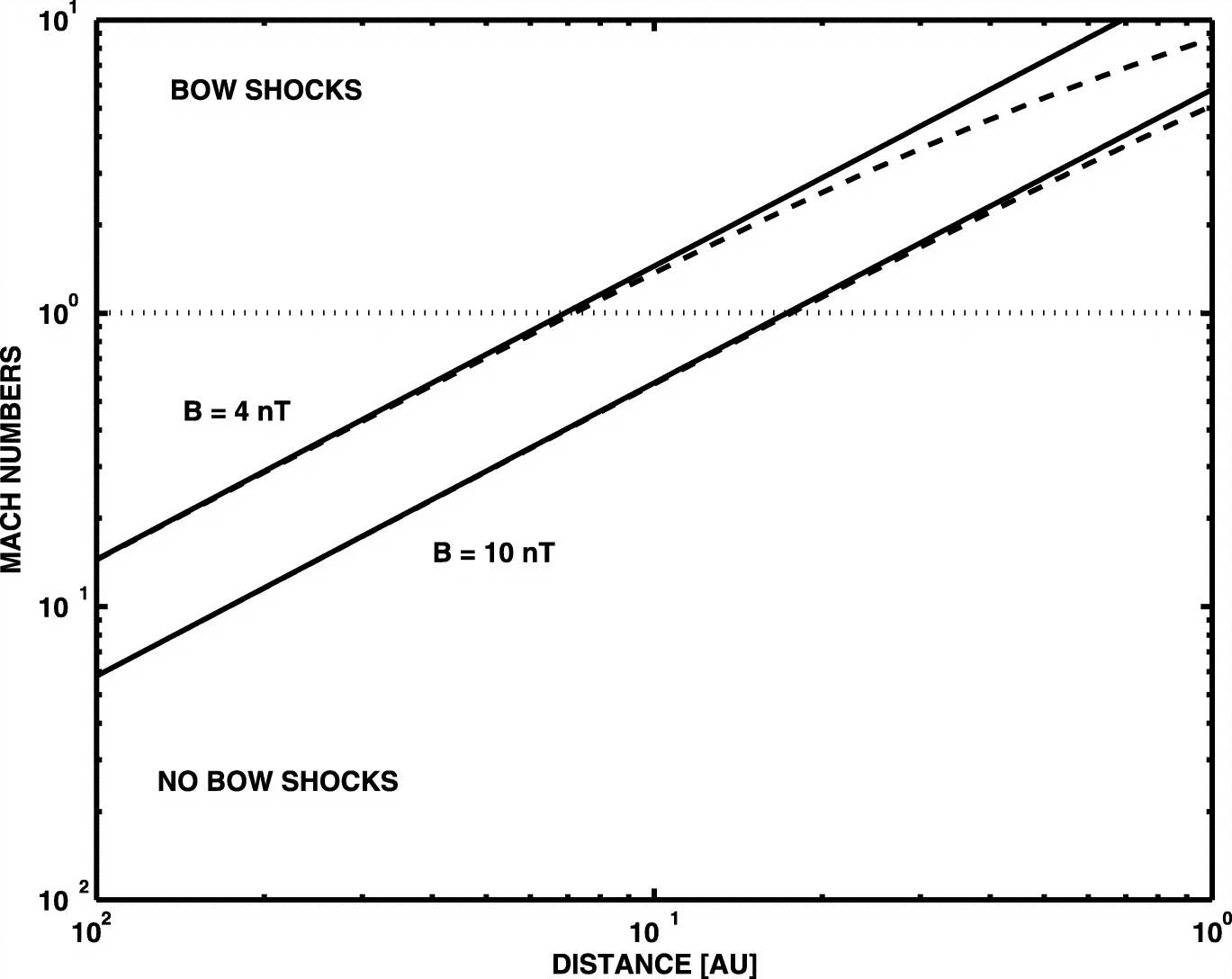 Alfvén Mach number (solid line) and the magnetosonic Mach number (dashed line) as a function of the orbital distance. The dotted line indicates the transition region. The Mach numbers are calculated for two magnetic field strengths (4 and 10 nT).