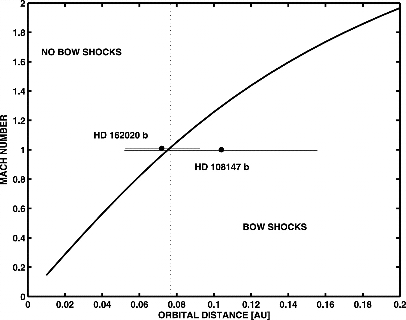 Eccentricity of the orbits of HD 108147b and HD 162020b and the magnetosonic Mach number. The dotted line separates the region where bow shocks occur from the region without bow shocks, while the thin solid lines indicate the eccentricity of the exoplanetary orbits.