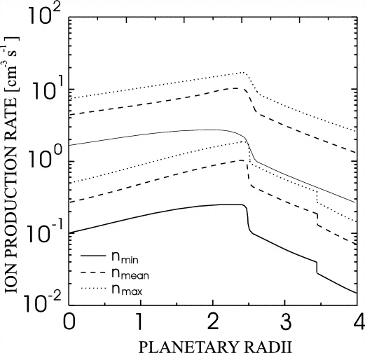Total hydrogen ion production rates (charge exchange, XUV ionization, electron impact ionization) of the evaporating hydrogen atmosphere of HD 209458b at an orbital distance of 0.045 AU (slow shock regime: three upper curves) and a hypothetical similar exoplanet at 0.2 AU (fast shock regime: three lower curves) as a function of planetary radii. The solid curves correspond to an exobase H number density of 104 cm−3, the dashed curves to ﹩5\times 10^{4}﹩ cm−3, and the dotted lines to 105 cm−3.