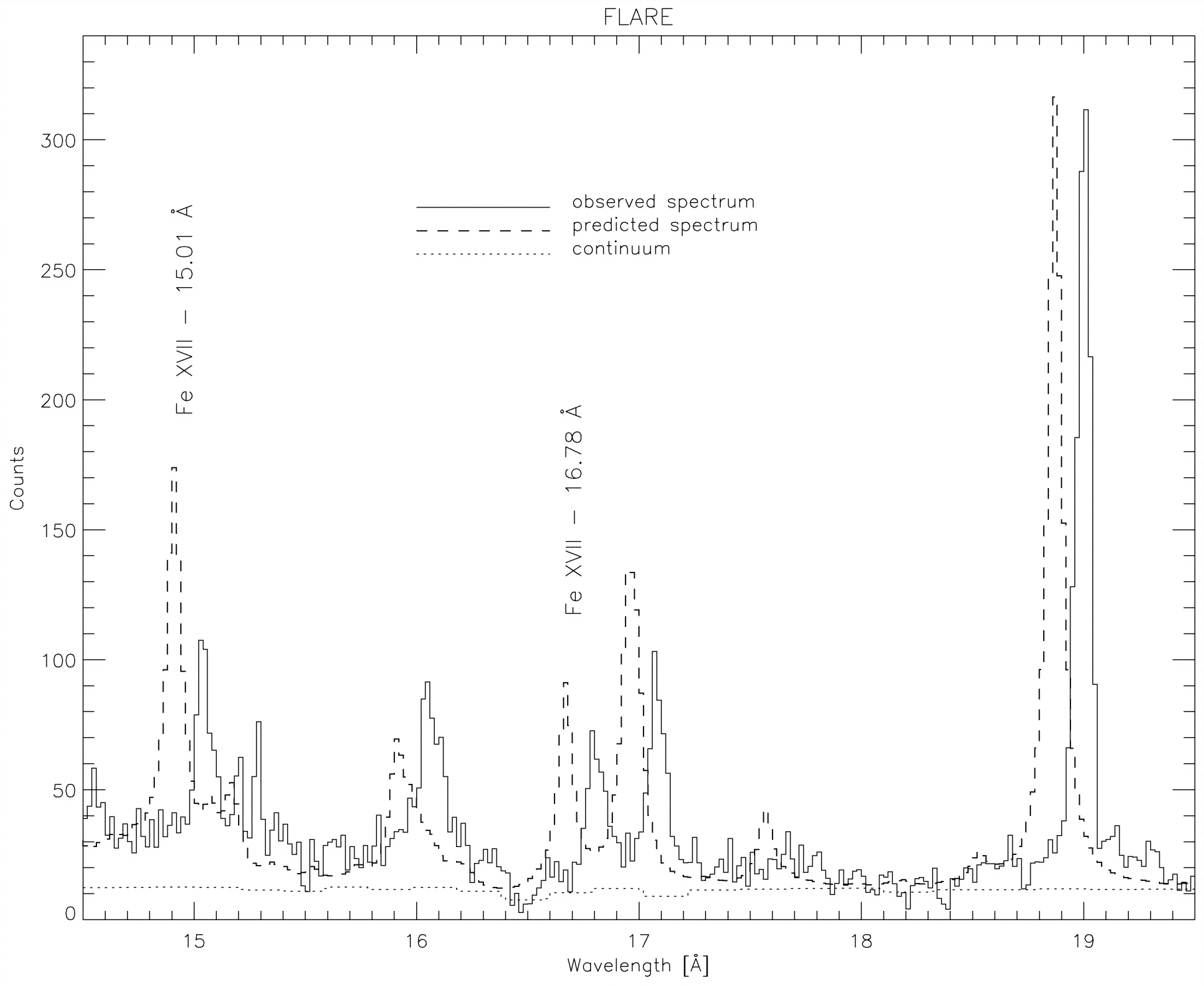 Observed spectrum (solid line), predicted spectrum (dashed line), and continuum (dotted line) of the flare. The predicted spectrum has been calculated using the new atomic calculation of Doron & Behar (2002). The wavelength grid of the predicted spectrum has been shifted by 0.1 Å for clarity. The observed overpredicted ratio for the Fe XVII 15.01 Å line is lower compared to the quiescent state.