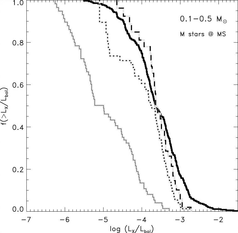 Evolution of the fractional X‐ray luminosity. The lines and symbols are defined in Fig. 4.