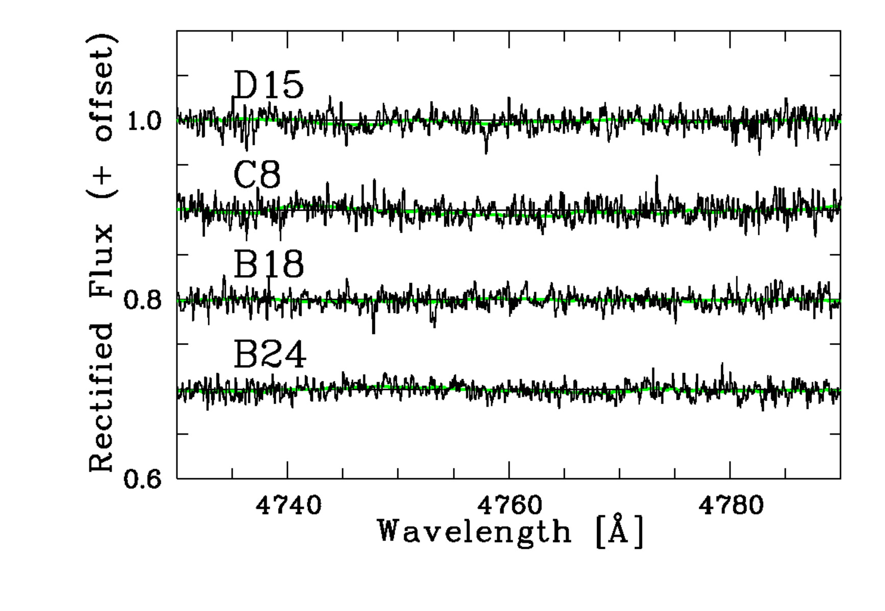 Wavelength region of echelle order 98 in the slow rotator D15 and the three program stars, offset with respect to one another for clarity. The interactively normalized, radial velocity corrected and rebinned (﹩R=20,000﹩) spectra are shown. The green lines are the same spectra, median filtered with a width of 200 pixels to show the residual run of the continuum. These residuals are mostly confined to ±0.5%.