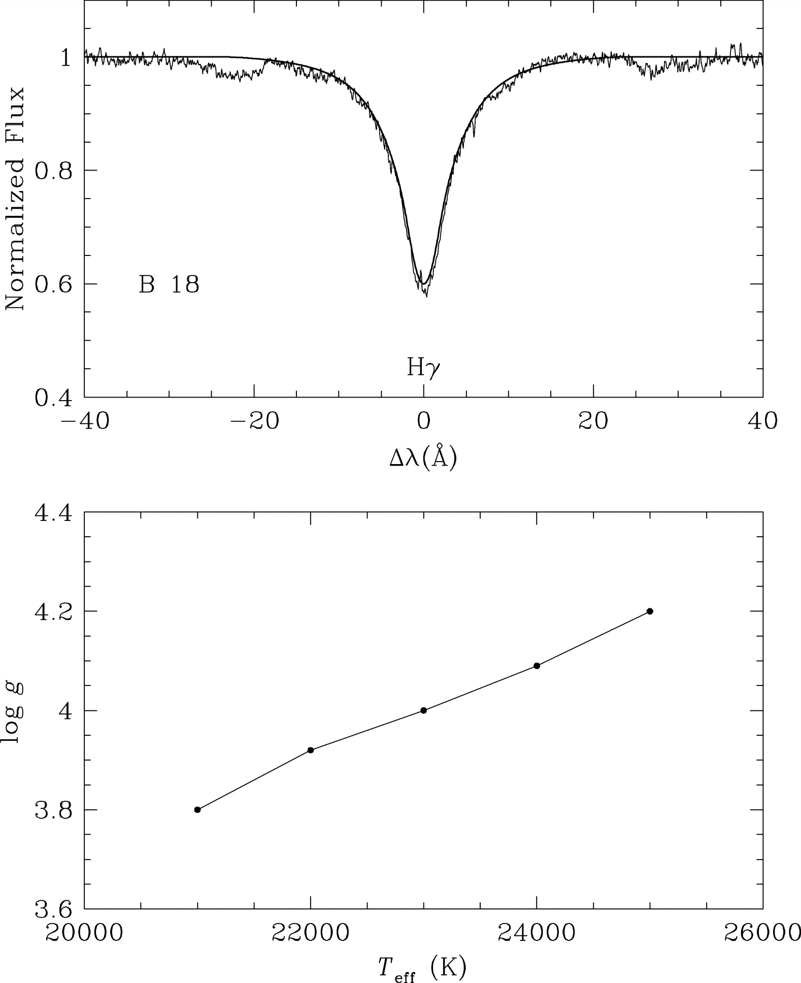 Example of how the Hγ profile constrains the stellar parameters. The main dependencies are Teff and ﹩\mathrm{log}\,g﹩; [M/Fe] and ﹩v\mathrm{sin}\,i﹩ play a minor role (not shown here).